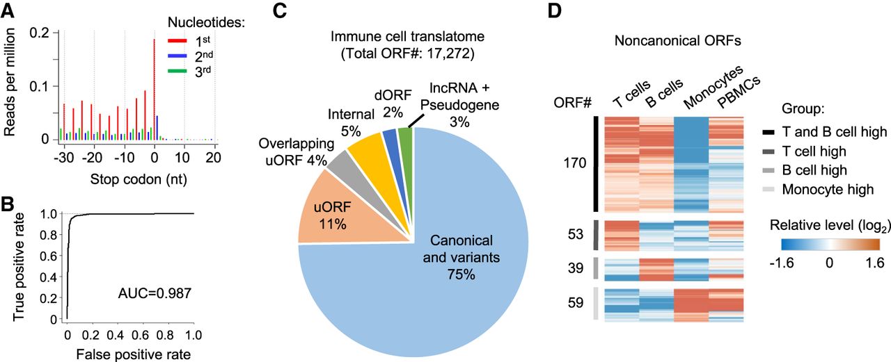 Regulation of noncanonical ORFs among primary immune cells. (A) Adjusted RNase footprinting read distribution around the stop codons of mRNAs. For footprints showing strong 3-nt periodicity, we adjusted their 5′-end genomic location to the ribosomal A-sites and plotted the RPM values (for details, see Methods). (B) The ROC curve measuring the RibORF performance in classifying in-frame-translated ORFs versus internal off-frame ORFs using RNase footprinting data in immune cells. The area under the ROC curve (AUC) value is shown. (C) The RibORF-identified genome-wide translated ORFs in immune cells, which were grouped based on their genomic locations. (uORF) ORF in 5′ UTR, (dORF) ORF in 3′ UTR, and (internal) ORF within canonical ORFs. (D) The heatmap showing lncRNA ORFs and uORFs with dynamic regulation of ribosome occupancy comparing T cells, B cells, and monocytes.