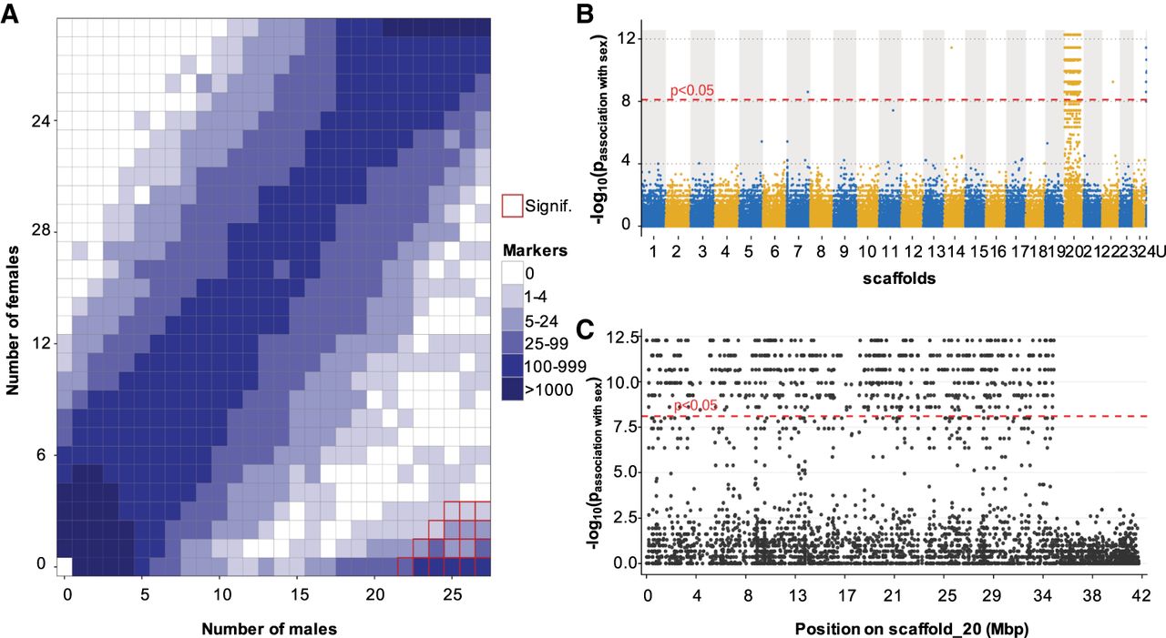 Identification of the sex chromosomes by RAD-tag sequencing. (A) Distribution of RADSex markers between males (horizontal axis) and females (vertical axis) using a minimum depth of 1 to consider a marker present in an individual. There were 892 markers significantly associated with male phenotypes in the tiles highlighted in red. (B) Manhattan plot showing the negative log of P-value of association with sex for all RADSex markers aligned to the genome. The vast majority of aligned markers significantly associated with sex (97%) was aligned to scaffold_20. (C) Negative log of P-value of association with sex for all RADSex markers aligned to scaffold_20. Markers significantly associated with sex aligned to a continuous region spanning from the start of the chromosome to ∼32.5 Mb.