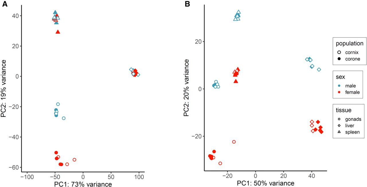 Principal component analysis of RNA-seq data. PC1 and PC2 of normalized and vst-transformed read counts for coding genes (A) and TEs (B) in the hooded crow genome (including W-linked contigs).