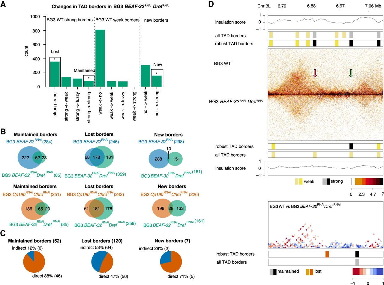 Functional role of Dref in 3D chromatin organization of BG3 cells. (A) Classification of robust TAD borders as described in the main text: lost (borders that are strong in WT and completely disappear in the knockdown); maintained (borders that are strong in WT and are maintained strong in the knockdown); and new (borders that appear strong in the knockdown); see Supplemental Figure S3A. (B) Overlap of lost, maintained, and new borders in the three knockdowns. (C) Number and percentage of maintained, lost, and new borders that have direct binding of BEAF-32, Cp190, and/or Chro (see Supplemental Fig. S4B). We considered common borders between the all three knockdowns (BEAF-32 single knockdown, Cp190 and Chro double knockdown, and BEAF-32 and Dref double knockdown). (D) Examples of genomic regions at DpnII restriction size resolution for BEAF-32 Dref double knockdown. We used the same types of plots as in Figure 1E,F.