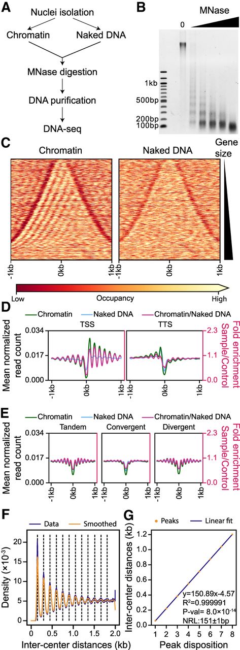 Nucleosome occupancy along the Paramecium MAC genome. (A) Schematic representation of the MNase-seq experiment. (B) MNase digestion of MAC chromatin with increasing MNase enzyme concentration. (C) Heatmap showing nucleosome occupancy ±1 kb around the center of each gene ordered by gene size (small genes on top and large genes at the bottom) for 38,143 genes located on scaffolds that are at least 200 kb long. (Left) Average of two chromatin-treated samples (Chromatin); (right) average of two naked DNA control samples (Naked DNA). (D) Average nucleosome occupancy around transcription start sites (TSSs) identified by 5′ CAP-seq on the left and transcription termination sites (TTSs) identified by poly(A) detection on the right: in green is the average profile of the chromatin-treated sample (Chromatin); in blue, the average profile of the naked DNA sample (Naked DNA); and in magenta, the Chromatin/Naked DNA ratio, enrichment of which is shown on the second axis on the right (red axis). (E) Average nucleosome occupancy ±1 kb around the center of intergenic regions: same color-code as in panel D. Intragenic regions have been divided into three groups based on the relative positions of gene pairs: tandem (left), convergent (middle), or divergent (right). (F) Inter-center distance between well-positioned nucleosomes (Methods) on the same scaffold. In blue are distance distributions from actual data (from 1 bp to 2 kb, binning = 1); in orange, the Gaussian smoothed signal. Black dashed lines indicate the local maxima (peak centers) of the smoothed data (Methods). (G) In orange are the first eight local maxima from panel F ordered by increasing distance; in blue, the linear fitted model. At the bottom right, information about linear fitting and estimated NRL (Mean ± SD) is given. P-value is calculated using a two-sided Z-test.