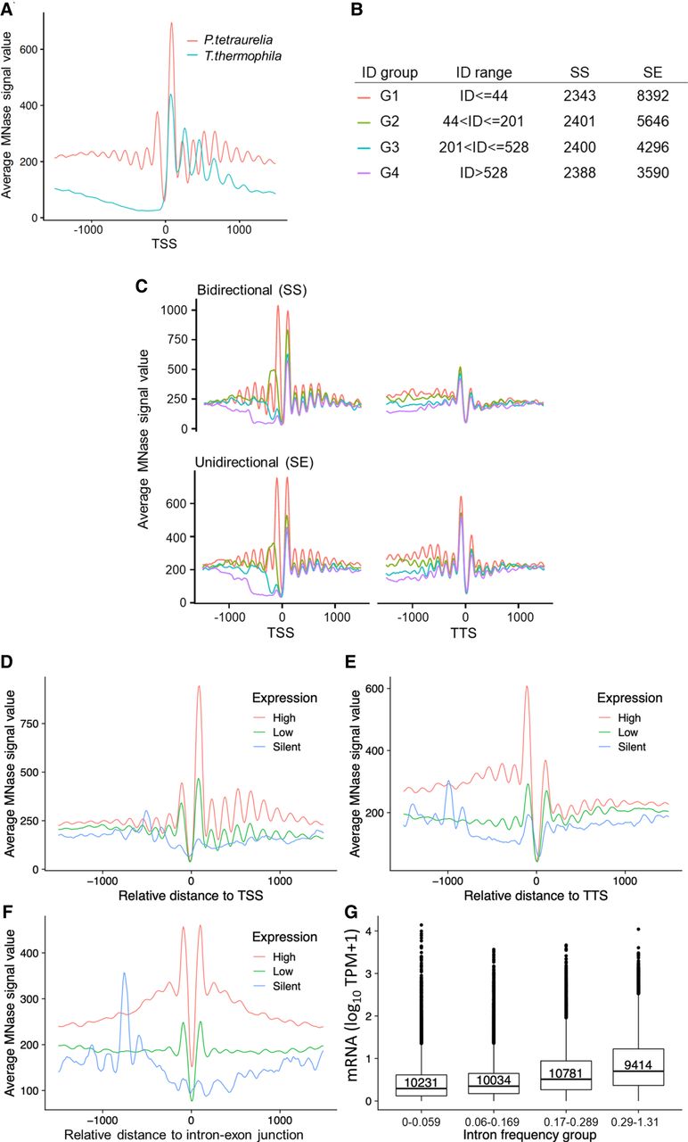 Positioning of nucleosomes in relation to gene expression. (A) Profile plot for nucleosome distribution relative to the transcription start site (TSS) for all analyzed Paramecium genes. Signal for 1000 bp upstream of and downstream from the TSS is shown. For comparison, MNase-seq data from T. thermophila were plotted in the same manner. (B) Dissection of neighboring Paramecium genes based on their configuration and intergenic distance (ID). Table shows separation of genes by configuration and ID, ranked from short distances (G1) to long distances (G4). The last two columns indicate numbers of genes in each configuration and ID group. (C) Nucleosome profiles in a 2-kb window centered at the TSS (left) or the TTS (right) for neighboring genes in SS and SE configuration are shown. Genes were additionally separated by the length of intergenic distances; see color-coding in B. The nucleosome profiles in relation to their distance (x-axis) to TSS (D), TTS (E), and intron–exon junction (F) are shown for gene categories based on their expression levels. (G) Box plots showing the mRNA expression (y-axis; log10 TPM + 1) of genes with different intron frequency groups (number of introns per 100 bp; x-axis). A Kruskal–Wallis test showed that the expression distribution between all pairs of intron frequency groups is significantly different (P < 2.2 × 10−16).