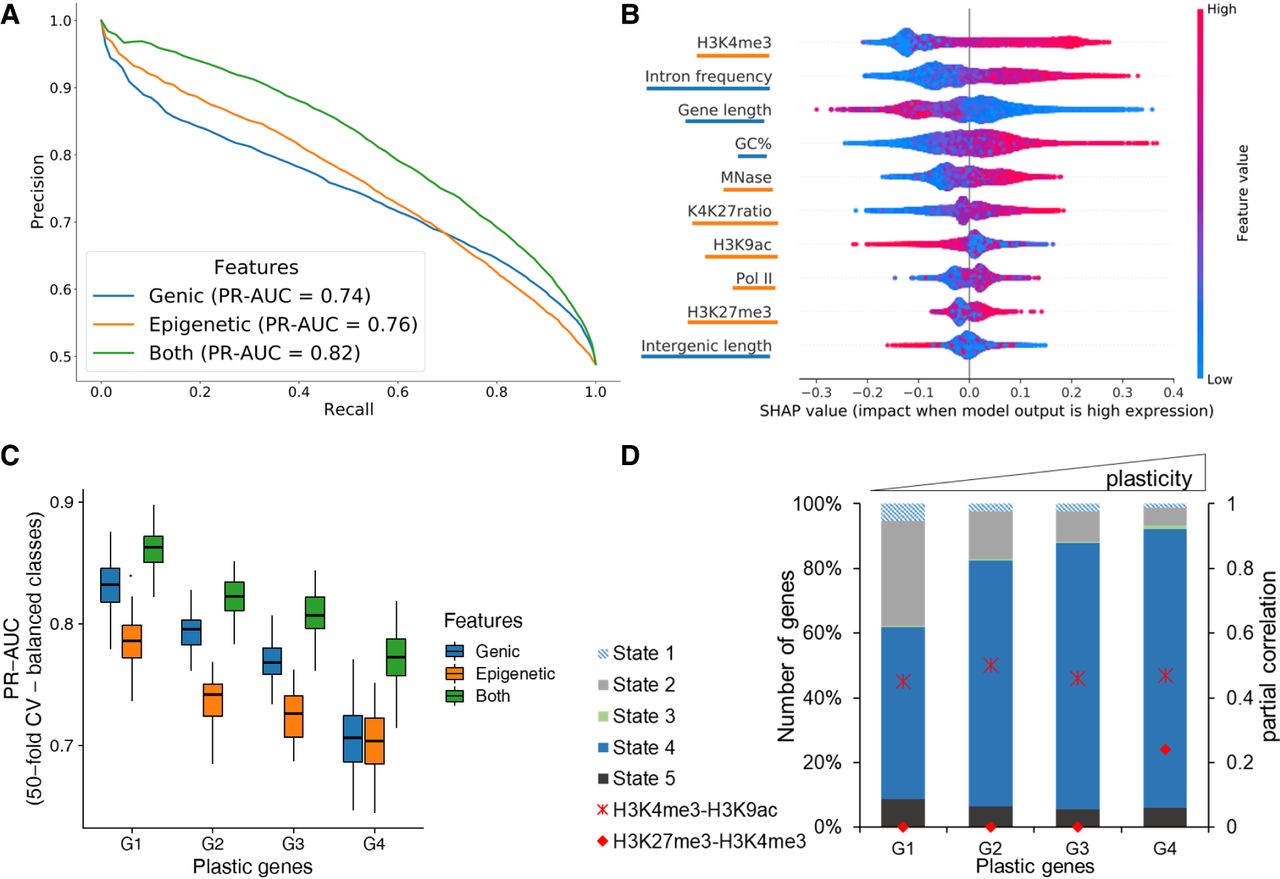 Prediction of gene expression by epigenetic marks and genomic features. (A) Results of classifying low and high gene groups using different data (genic: related to gene structure; epigenetic: using abundance of histone marks and MNase; both: genic and epigenetic). PrecisionRecall curve with average values from a 40-fold cross-validation with random forests indicating features by different colors. (B) Analysis of feature importance using both genic and epigenetic features (underlining color indicates type on y-axis; see legend for A). Features are listed in decreasing order of classification importance from top to bottom. The importance (SHAP value; x-axis) of a feature for each gene illustrates its contribution to classification as high or low, with positive and negative SHAP values, respectively. The color gradient depicts the feature value in scale from low to high, for example, the length of a gene (third row). For example, long genes strongly contribute to the prediction of lowly expressed genes. (C) Genes were separated into four groups by their plasticity, which is defined by a large variation in gene expression among different conditions. The box plot shows the distribution of classifier performance values for genes with different plasticity (50-fold CV-based PR-AUC) for the same three feature sets as A. The number of genes in each plastic gene group was randomly subsampled to have equal number of genes in high and low expressed category. (D) Distribution of CSs among plastic gene groups. We only included genes with a ChromHMM state overlap of at least 80% (see Fig. 5). Additionally, partial correlation values for H3K4me3-H3K9ac (cross) and H3K4me3-H3K27me3 (circle) are red for each group.