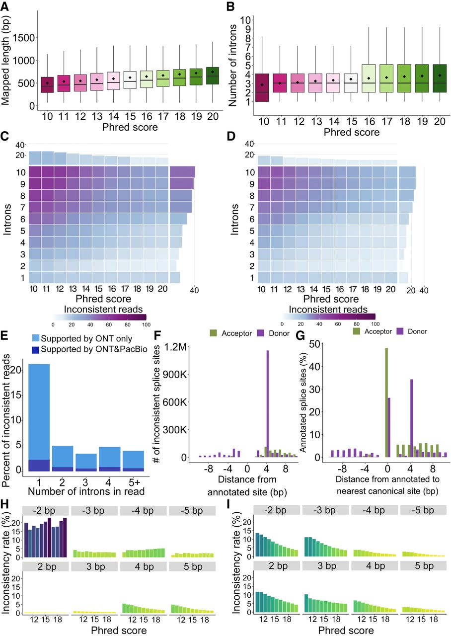 Characteristics of all ONT reads including nonbarcoded ones for Sl-ISO-Seq data. (A) Aligned read length with respect to read Phred score (average across all read bases) for all ONT reads from the Sl-ISO-Seq data set. (B) Read intron chain length with respect to read Phred score for all ONT reads from the Sl-ISO-Seq data set. (C) Heatmap showing average inconsistency rate between read intron chains and annotated intron chains (exact comparison, delta = 0 bp) with respect to read Phred score (x-axis) and intron chain length (y-axis) for all ONT reads from the Sl-ISO-Seq data set. Barplot at the top (on the right side) summarizes the inconsistency rate with respect to only the Phred score (only intron chain length). Purple corresponds to a higher inconsistency rate, and light blue indicates a lower inconsistency. (D) Same as C, but using inexact intron chain comparison (delta = 6 bp). (E) Histogram showing a fraction of inconsistent ONT reads that have at least one intron entirely contained inside an annotated exon. Dark blue represents reads for which the contained intron is supported by at least one PacBio read, and light blue corresponds to the rest of ONT reads. (F) Number of inconsistent donor (purple) and acceptor (green) splice sites in ONT reads from the Sl-ISO-Seq data set with respect to the distance from the annotated splice site. (G) Percentage of annotated canonical donor (green) and acceptor (purple) splice sites with respect to distance to the nearest canonical dinucleotides (GU for donors, AG for acceptors). Zero corresponds to the case when no canonical dinucleotides were detected within 10 bp. (H) Inconsistency rates of individual acceptor splice sites in ONT reads from the Sl-ISO-Seq data set with respect to reads’ Phred scores. Each histogram represents splice sites with a certain distance from the annotated splice site (gray bars on top). (I) Same as H, but for donor splice sites.