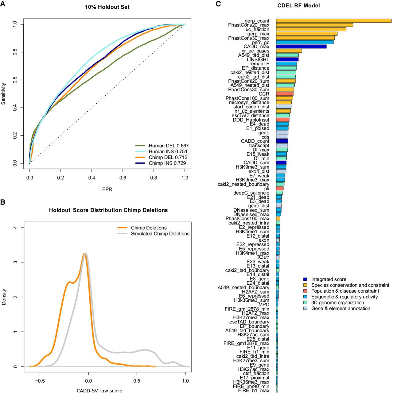 Performance of random forest models trained on proxy-deleterious and proxy-benign SVs. (A) All models show a nonrandom separation of the two classes in a random 10% holdout. Performance is measured as sensitivity over false positive rate (FPR). Note that all training data sets contain a high amount of mislabeled SVs, as a majority of proxy-deleterious SVs is likely to be neutral. (B) Model predictions of the chimpanzee deletion model are shifted toward high-impact SVs in the simulated set of chimpanzee deletions. (C) Representation of feature importance in the chimpanzee deletion random forest model. Note that proxy-pathogenic and proxy-benign sets are length-matched and that length is not used as an explicit feature. Most important contributions come from species conservation (e.g., GERP, phastCons) but also from integrated scores (i.e., CADD or LINSIGHT). Epigenetic features as well as 3D genome architecture features, such as the Directionality Index derived from Hi-C data, also contribute to the most informative features of the models. For a full list of features and explanation of their naming, see Supplemental Table 1.