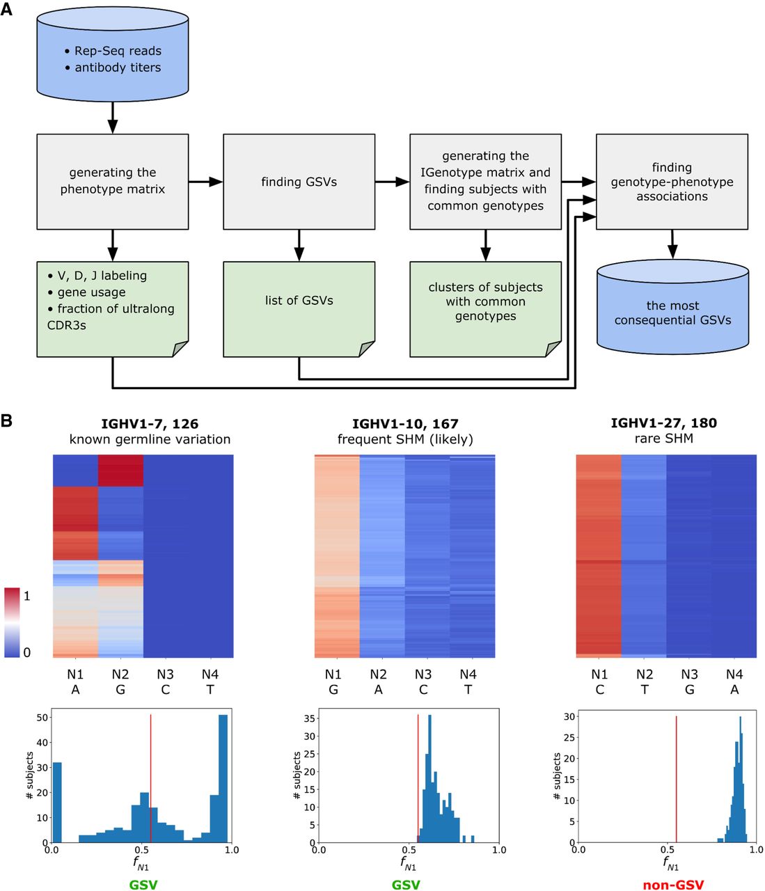 Overview of IgQTL method. (A) The IgQTL pipeline. Gray rectangles show various steps of the IgQTL pipeline. The input (Rep-Seq reads and antibody titers) and the final output (the most consequential GSVs) are shown in blue. Intermediate output is shown in green. (B) The procedure for finding GSVs (126, IGHV1-7, A/G) and (167, IGHV1-10, G/A), as well as non-GSVs (180, IGHV1-27, C/T). Heat maps in the upper row show the fractions of the nucleotides across all subjects varying from 0 (blue) to 1 (red). Columns are arranged according to the sum of fractions across all subjects. N1 and N2 correspond to the first and the second columns, respectively. Histograms in the lower row show distributions of fractions fN1 across 204 animals. The red vertical line in each histogram corresponds to freq = 0.55.