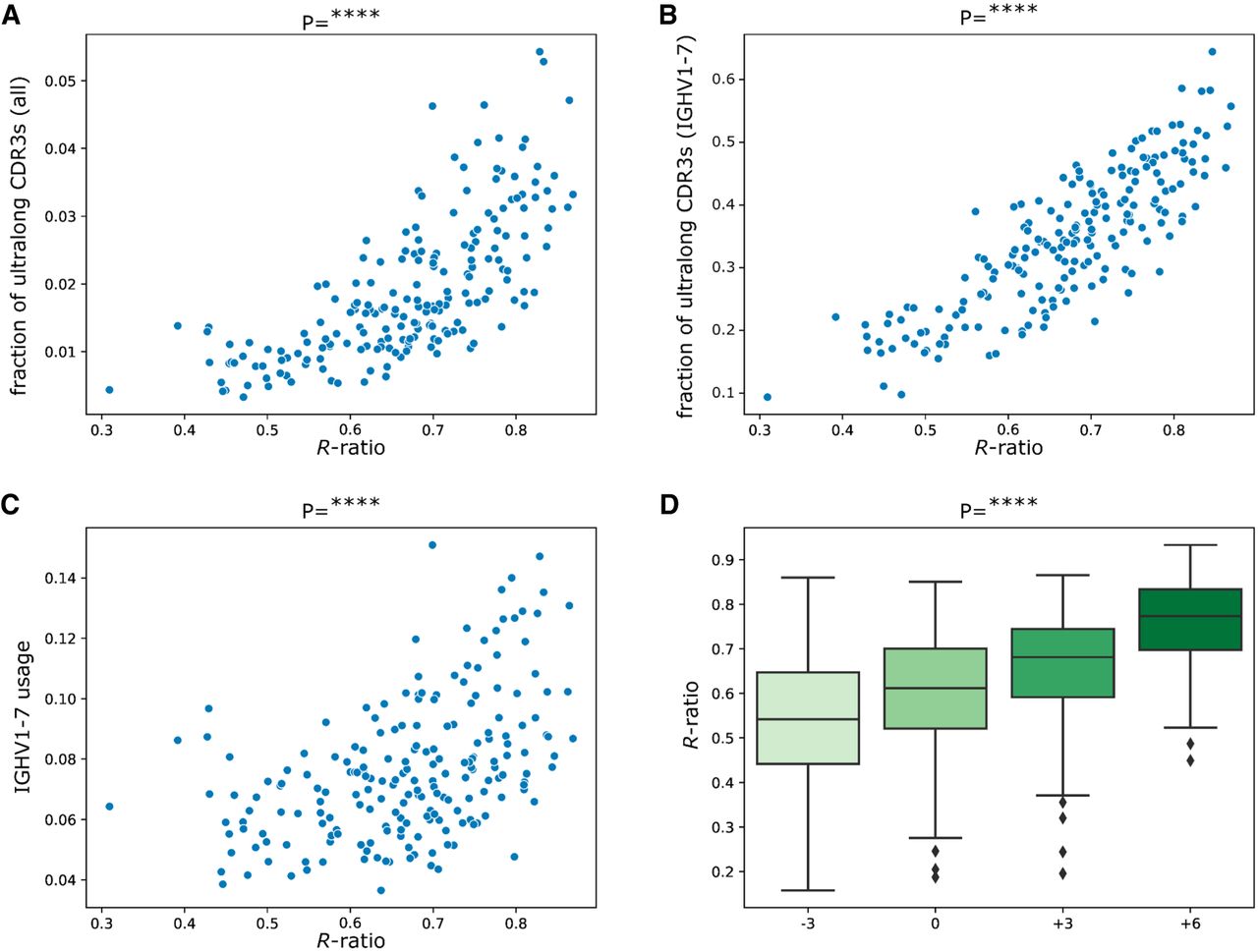 GSV at position 148 of IGHV1-7 is associated with production of ultralong antibodies. (A) Fractions of ultralong CDR3s in all CDR3s versus R-ratios of the GSV G148A in IGHV1-7. (B) Fractions of ultralong CDR3s in all CDR3s derived from IGHV1-7 versus R-ratios of the GSV G148A in IGHV1-7. (C) Usages of IGHV1-7 in the combined data set versus R-ratios of the GSV G148A at position 148 in IGHV1-7. (D) Distributions of R-ratios for position 148 in IGHV1-7 at four time points.