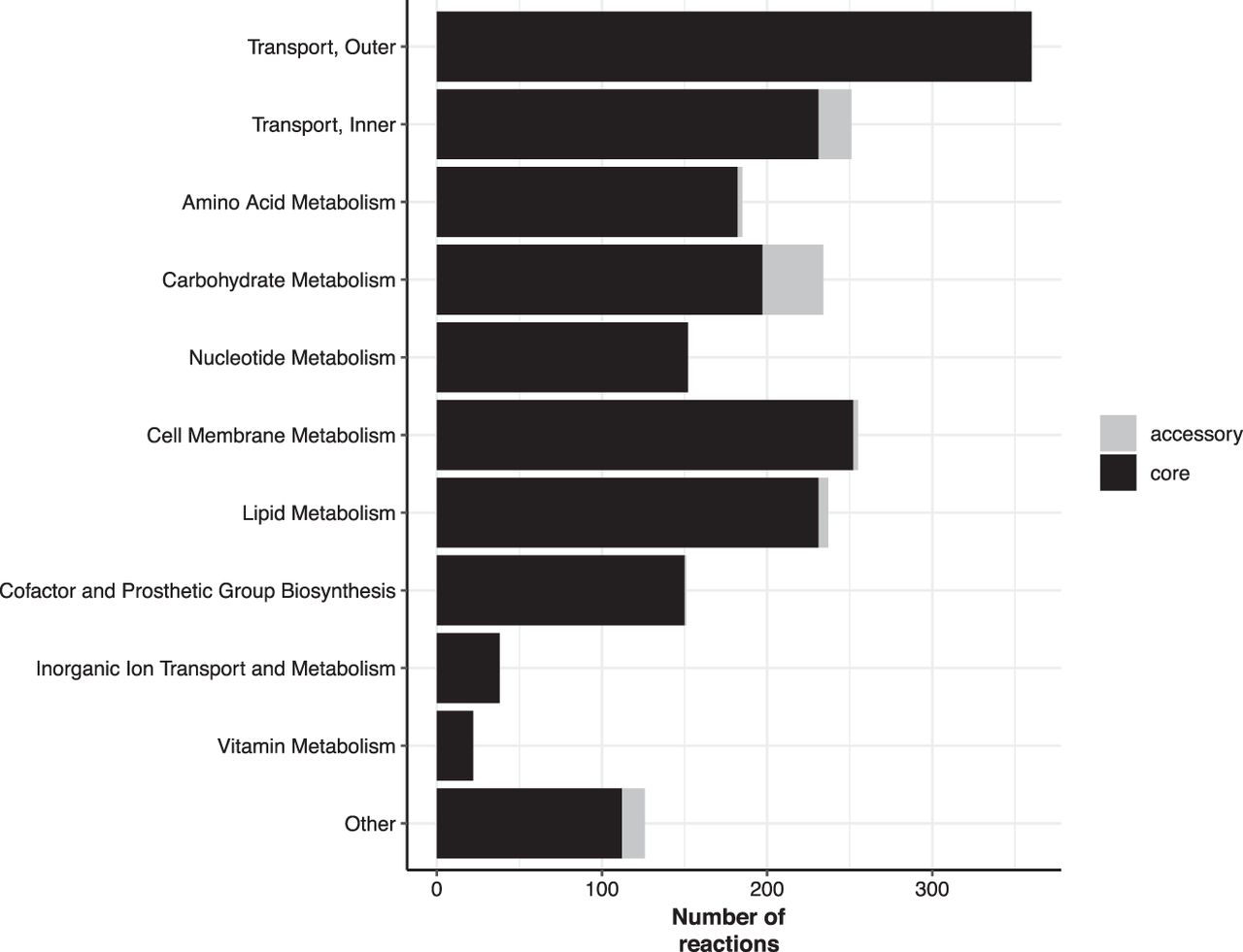 Number of model reactions by category. Bars are colored to indicate core reactions (black, conserved in all strains) and accessory reactions (gray, variably present).