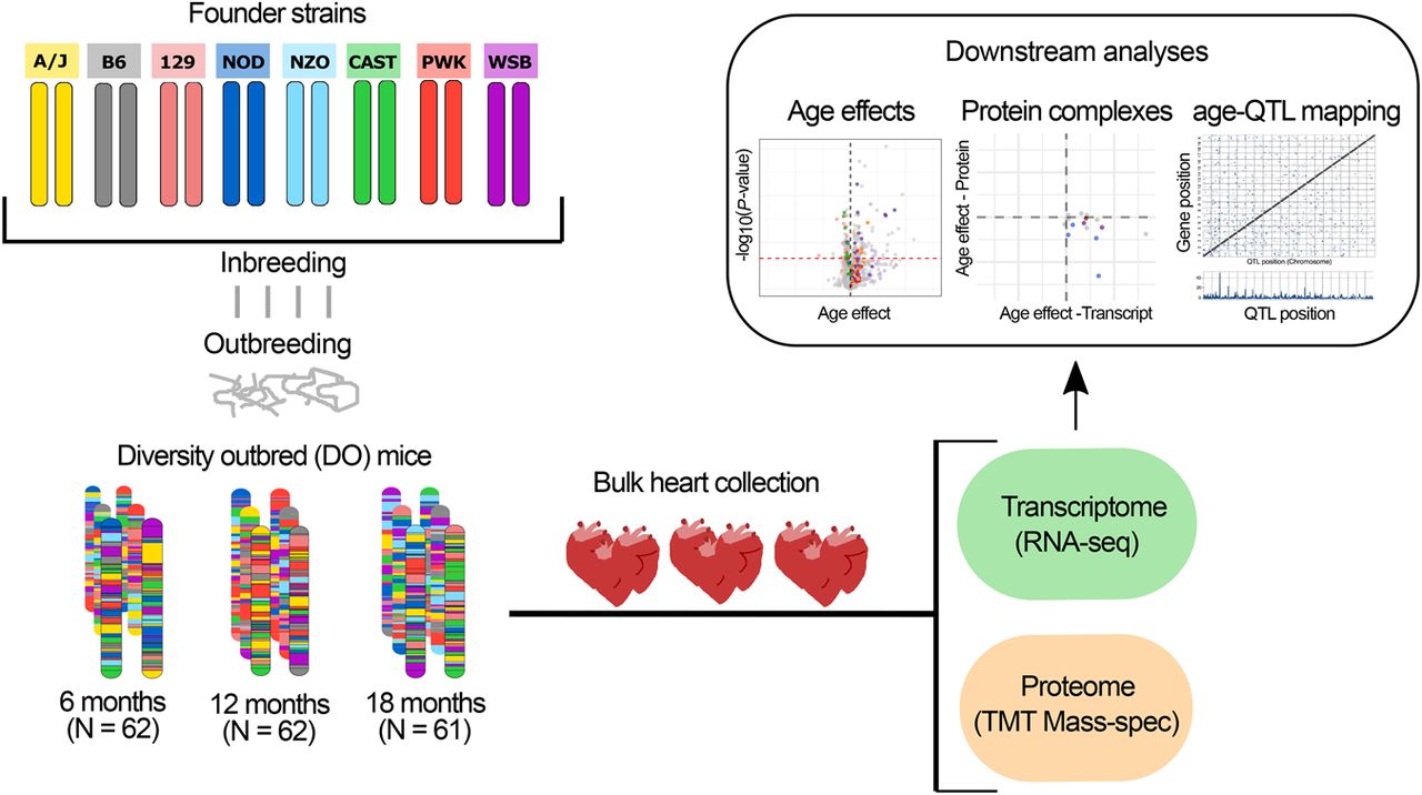 Transcriptome and proteome profiling of the aging heart in genetically diverse mice. DO mice are descended from eight inbred founder strains. Each DO mouse is genetically unique. We obtained cross-sectional samples of tissues from approximately equal numbers of mice aged to 6, 12, or 18 mo. Bulk heart tissue was collected for RNA-seq and mass spectrometry protein analysis. We performed analyses to detect and characterize age-related changes in transcript and protein abundance. We performed functional enrichment of gene sets with age effects, characterized changes in correlation of subunits within protein complexes, and mapped genetic variation that influences age-related changes in transcripts and proteins (age-QTL).