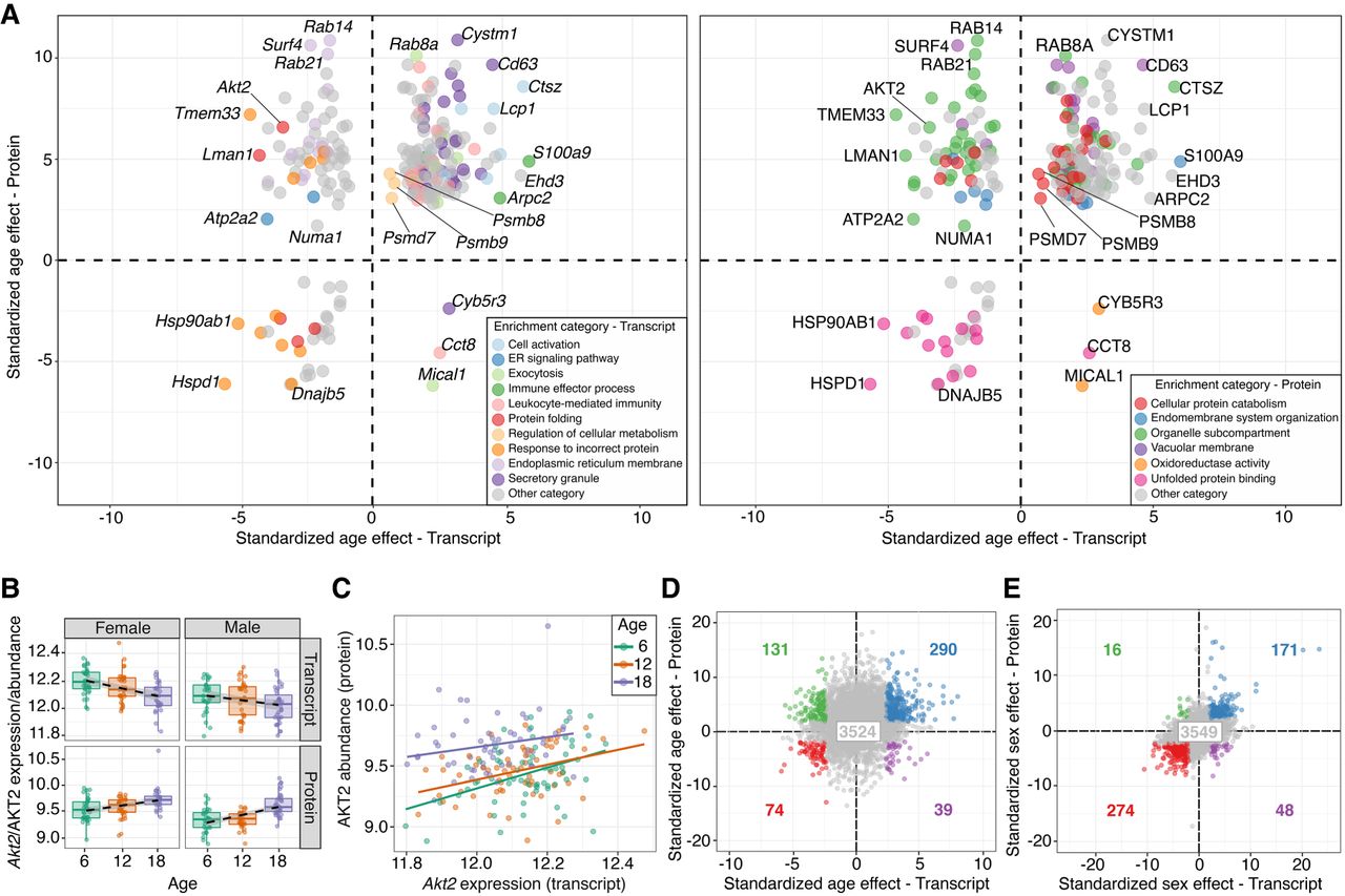 Comparisons of age effects on transcripts and proteins reveal similarities and differences. (A) Standardized age effects for transcripts (x-axis) and proteins (y-axis) with genes highlighted based on enrichment analysis results from the transcriptome (left) and proteome (right). Colored points represent enrichment categories of genes based on enrichment sets defined by transcripts (left) and by proteins (right). Gray points represent genes that were not annotated to one of the highlighted sets. Horizontal and vertical lines at 0 included for reference. (B) Change in transcript (top) and protein (bottom) abundance (y-axis) of the gene Akt2 with age (x-axis), stratified by sex (with females on left and males on right). Best fit lines included to emphasize trends. (C) Protein abundance by transcript expression for the gene Akt2. Points are colored based on age group. Best fit lines for each age group included to illustrate correlation. (D) Standardized age effects for all the proteins (y-axis) plotted against the effect for their corresponding transcripts (x-axis). Blue points represent genes that have concordant increases with age for both transcripts and proteins. Green points represent genes that have discordant decreases with age for transcripts but increases for proteins. Purple points represent genes that have discordant increases with age for transcripts but decreases for proteins. Red points represent genes that have concordant decreases with age for both transcripts and proteins. Gray points represent genes that do not have a significant age effect (FDR > 0.1) for both transcript and protein. The number in each quadrant corresponds to the number of total genes in each group. Horizontal and vertical lines at 0 included for reference. (E) Standardized sex effects for all the proteins (y-axis) plotted against the effect for their corresponding transcripts (x-axis). Points colored as in D with the corresponding number of total genes in each group.