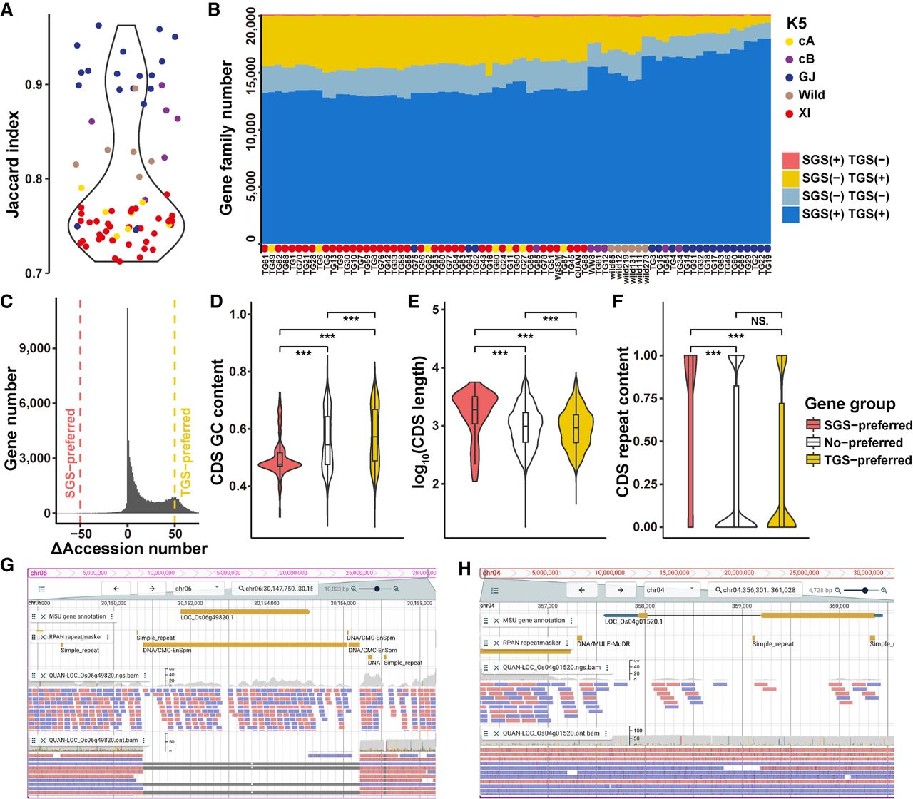 Comparison of gene family PAVs derived from the SGS and TGS data. (A) Jaccard Indices of gene family PAVs derived from SGS and TGS. (B) The number of gene families in each rice accession detected from SGS or TGS. In most rice accessions, especially in population XI, many more gene families were detected from the TGS data than the SGS data. (C) The number of genes versus their ΔAccession numbers. For each gene, its ΔAccession number = number of accessions with this gene detected by TGS − number of accessions with this gene detected by SGS; >50: TGS-preferred genes (n = 9321); <−50: SGS-preferred genes (114); and −50 ∼ 50: No-preferred genes (65,870). (D–F) CDS feature comparison for genes preferred by SGS or TGS. (D) GC contents, (E) lengths, (F) repeat contents. A two-sided Wilcoxon rank-sum test was used to measure the significance of differences. (***) P < 0.001. (G) The read alignment of gene LOC_Os06g49820 in rice accession QUAN indicates that a deletion near this gene is ignored from SGS. (H) The read alignment of another gene LOC_Os04g01520 indicates insufficient reads from SGS are mapped to this gene region, whereas reads from TGS cover it.