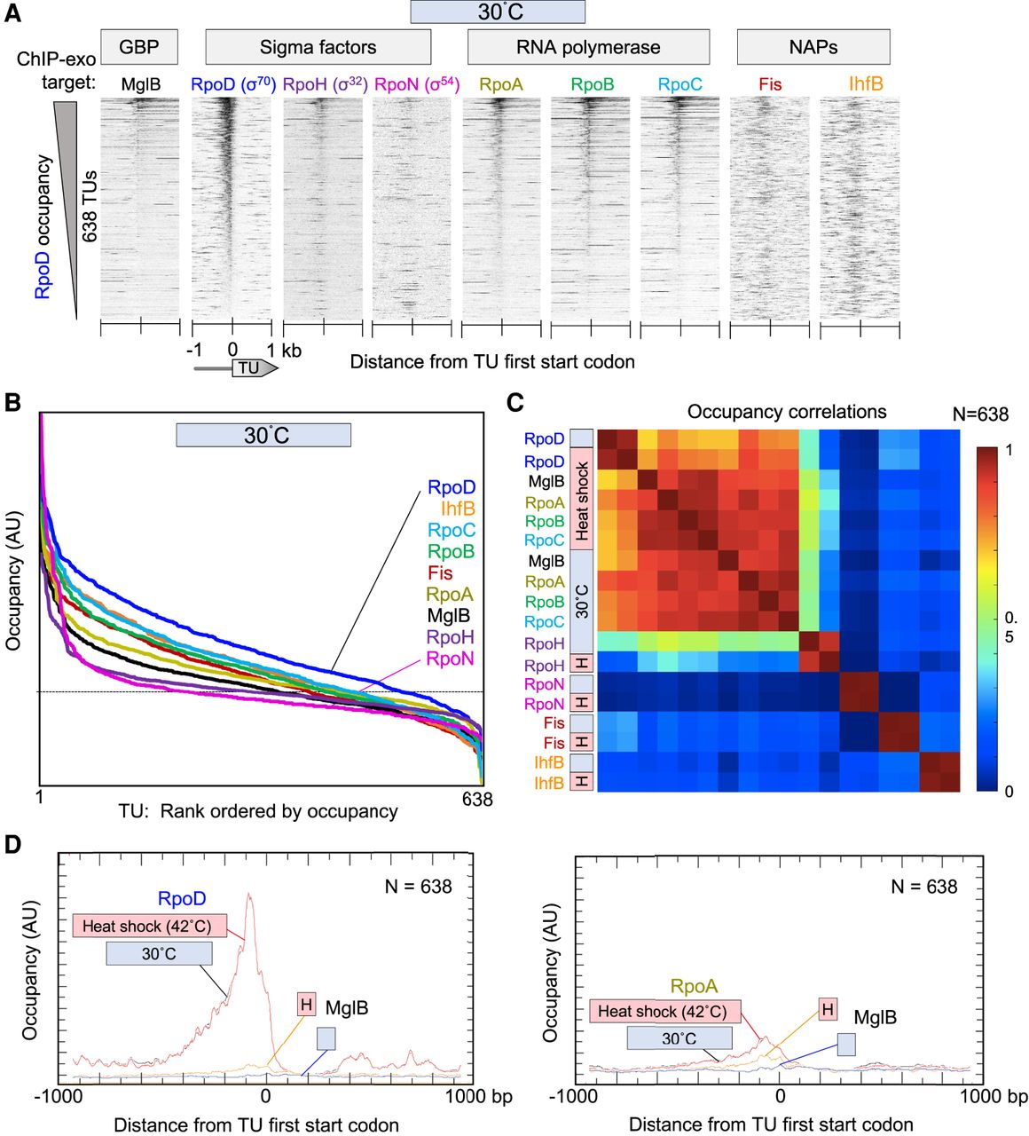 Sigma factors and RNAP binding at RpoD promoter regions. (A) Heatmap of occupancy distribution of the indicated protein targets as measured by ChIP-exo. Transcription units (TUs; rows, N = 638 TUs) are aligned by their ATG start codons (5′-3′, left to right) and sorted by RpoD occupancy (summed −80 to +80 bp from TU ATG start) at 30°C. ATG starts were used instead of TSSs because TSSs have more experimental error, condition-specific biological variability, and variance among strains compared with DNA elements. Sense and antisense tags were shifted in the 3′ direction by 6 bp (to adjust for the headroom of lambda exonuclease) and merged. Data files have an x-axis bin size of 2 bp. (B) Relative occupancy level in arbitrary units (AUs) on a linear scale for individual target proteins, rank ordered by their occupancy level at 638 TUs from panel A. The dashed line represents the approximate midpoint observed with targets that are expected to be background. (C) Heatmap matrix of correlation coefficients for co-occupancy of targets from panel A (from −500 to +100 of a TU ATG start). Heat shock, or H, denotes instantaneous change from 30°C to 42°C for 6 min. (D) Composite (averaged) plots of RpoD, RpoA, and MglB occupancy from panel A (30°C) and from Supplemental Figure S1 (6 min, 42°C). AU denotes arbitrary linear units. Data files have an x-axis bin size of 2 bp. The MglB data are the same in both panels. To compare y-axis magnitudes between same-target samples from 30°C and 42°C, gene-averaged y-axis values were empirically scaled (i.e., one scaling factor per data set) to achieve similar y-axis minima values in the x-axis window (i.e., to achieve similar average local background). This assumes that the minima are background.