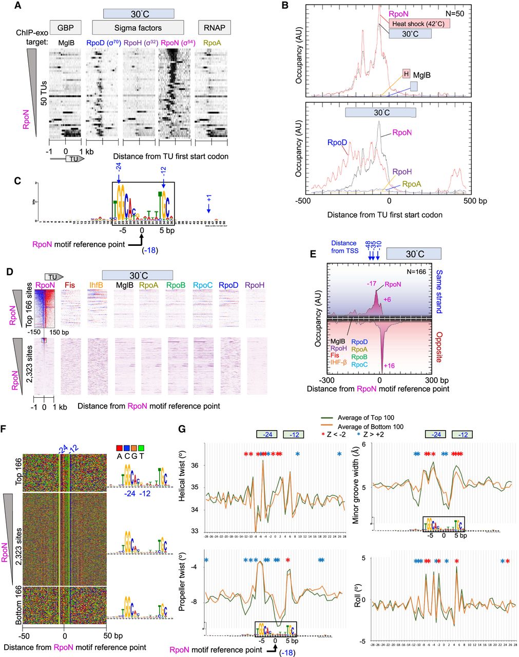 Genome-wide interactions of RpoN at RpoN promoters. (A) Distribution of RpoN around the ATG start codons of 50 RpoN-bound TU. Data are sorted based on RpoN occupancy ±500 bp from the ATG start of each gene. For additional figure details, see Figure 1A. (B) Composite plots of sigma factor, RpoA, and MglB occupancy at RpoN-bound TUs from panel A. Plots also include heat shock data from Supplemental Figure S4. For details, see Figure 1D. (C) MEME motif derived from the top 500 RpoN-bound locations as described in Figure 2A. (D) Heatmap occupancy of indicated protein targets at 30°C distributed around RpoN motif reference points. For plotting details, see Figure 2B. (E–G) Distribution around RpoN motifs of RpoN and other target occupancies at 30°C (E), nucleotide sequence (F), and DNA shape (G). For plotting details, see Figure 2, D through F.