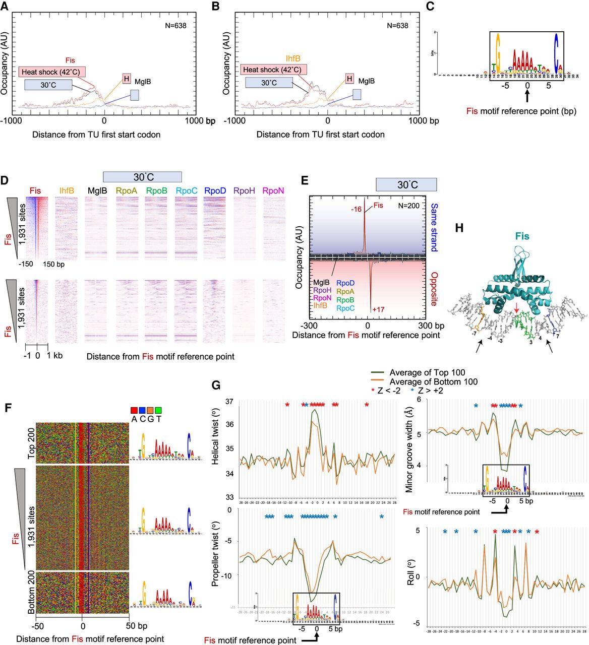 Genome-wide interactions of Fis. (A,B) Composite plots of Fis (A) or IHF (B) and MglB occupancy around the ATG start codons of 638 TUs. Plots also include heat shock data from Supplemental Figure S5. (C) MEME motif derived from the top 500 Fis-bound locations as described in Figure 2A. (D) Heatmap occupancy of indicated protein targets at 30°C distributed around the Fis motif reference point. For plotting details, see Figure 2B. (E–G) Distribution around Fis motifs of Fis and other target occupancies at 30°C (E), nucleotide sequence (F), and DNA shape (G). For plotting details, see Figure 2, D through F. (H) Crystal structure of Fis–DNA interactions (Stella et al. 2010). Black arrows indicate sites of contact. G and C nucleotides at −7 and +7 are colored (gold and blue, respectively), as is the poly(dA:dT) tract (green).