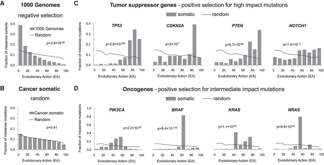 Coding variants under selection have nonrandom cohort integrals. The cohort integrals for all germline variants in the 1000 Genomes Project (A) and all somatic mutations from The Cancer Genome Atlas (TCGA; B). The somatic TCGA mutations were also shown for the tumor-suppressor genes TP53, CDKN2A, PTEN, and NOTCH1 (C) and for the oncogenes PIK3CA, BRAF, KRAS, and NRAS (D). The dashed lines correspond to simulated random amino acid changes in all human genes (A,B) or the respective single gene (C,D). The P-values of cohort integral differences between the observed and simulated random mutations were calculated by the one-tailed two-sample Kolmogorov–Smirnov test.