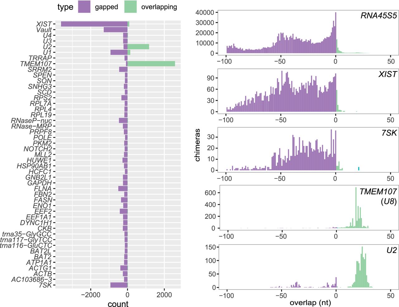 Distribution of overlap scores in individual genes in PARIS experiment. Counts of gapped and ungapped chimeras (purple) and overlapping chimeras (green) in individual genes in PARIS data from human HEK293 cells (Lu et al. 2016) (left), and distribution of the overlap value L in selected genes.