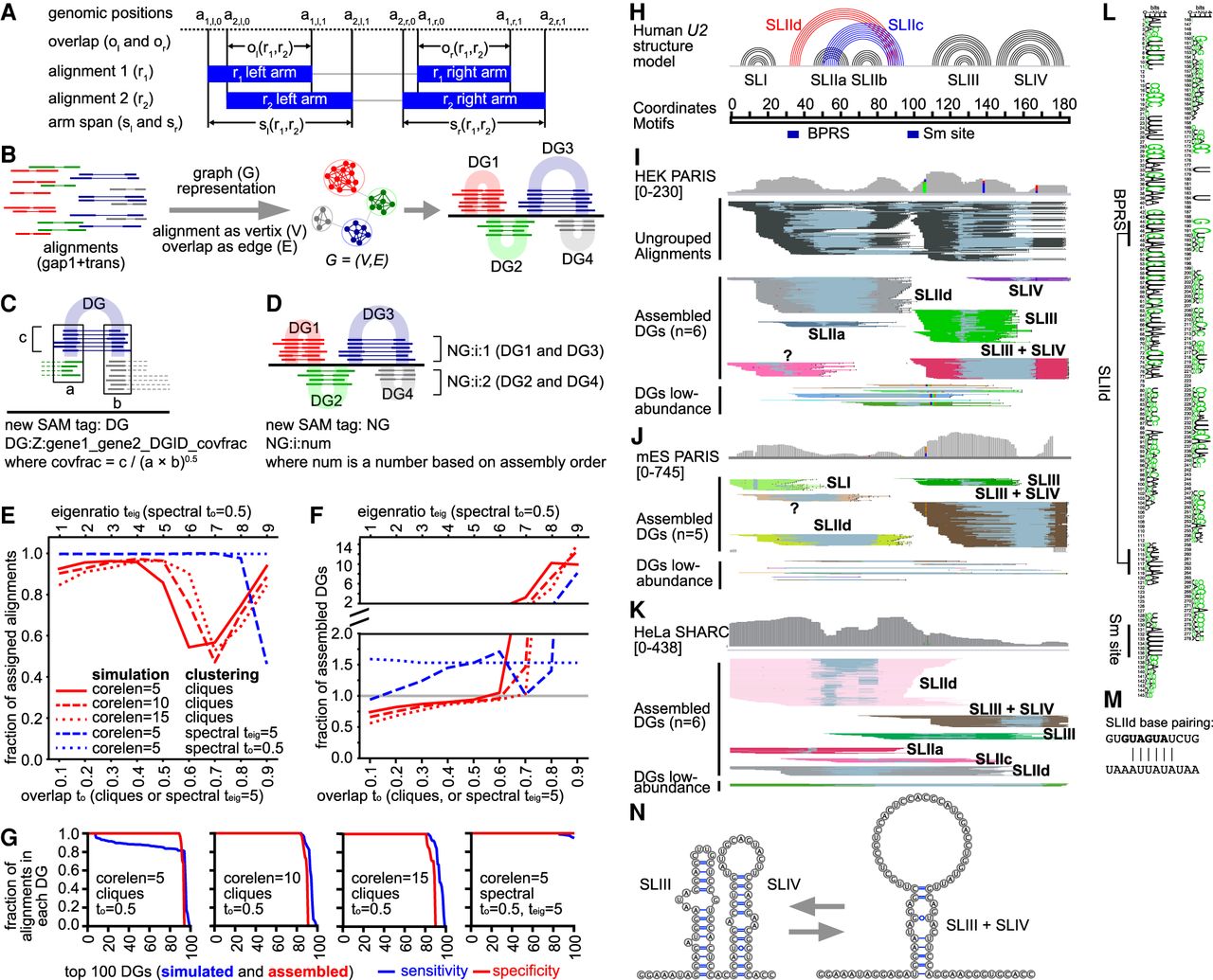 Network/graph-based method for automatic assembly of duplex groups underlying RNA structures and interactions (CRSSANT). (A) Overlap and span calculation for a pair of alignments. Two alignments r1 and r2 each comprising a left and right arm (solid blue bars), share left and right overlaps ol, or, respectively, and left and right spans sl, sr, respectively. The arm start and stop positions of read/alignment i are represented by the 4-tuple (ai,l,0, ai,l,1, ai,r,0, ai,r,1). The two arms can be on the same chromosome and strand (gap1.sam), or different ones (trans.sam). (B) Diagram for network/graph-based clustering. All alignments with a single gap (gap1 and trans) are represented as a graph where each alignment is a vertex and the relative overlap ratio between the arms is the edge. Highly connected vertices cluster together forming subgraphs, corresponding to individual DGs. (C) Diagram for the DG tag information. The string after DG:Z includes the names of the two genes that the DG connects (gene1 and gene2). gene1 and gene2 are identical when the DG describes intramolecular structures or homodimers. DGID is a number based on assembly order. covfrac (coverage fraction) is defined as the number of alignments in this DG divided by the geometric mean of the coverages at the two arms. (D) Diagram for NG assembly. Non-overlapping DGs (e.g., DG1 and DG3, DG2 and DG4) are combined into NGs for visualization in genome browers like IGV. (E,F) Benchmarking CRSSANT clustering on 100 simulated DGs. All alignments map to Chr 1: 1–1000 and consist of cores 5, 10, or 15 nt (corelen = 5, 10 or 15), and random extensions on each side between 5 and 15 nt. Gaps between the two cores are at least 50 nt and at most the length of the Chr 1: 1–1000. Each DG contains between 10 and 100 alignments. The alignments were clustered using cliques or spectral algorithms. For cliques, overlap threshold to was varied between 0.1 and 0.9. For spectral clustering, to was varied between 0.1 and 0.9 when the eigenratio threshold was set at teig = 5. Alternatively, for spectral clustering, teig was varied between 1 and 10 when to was set at 0.5. The fraction of assigned alignments (out of 5335 input) was plotted in panel E. The fraction of assembled DGs (against 100 input) was plotted in panel F. (G) For each simulated DG data set and clustering parameter combination, the sensitivity and specificity of DG assembly was calculated for each of the top 100 DGs. The sensitivity of DG assembly is defined as the fraction of remaining alignments in each DG after CRSSANT assembly. The specificity is defined as the fraction of alignments from the dominant simulated DG. (H) Human U2 snRNA structure model based on previous studies. (I,J) Human HEK and mouse ES PARIS data were clustered using CRSSANT. The DGs were labeled corresponding to the secondary structure models in panel H. Alignments are grouped in IGV using the NG tag. “?” is a new duplex not in the known structure model. (K) Human HeLa SHARC data were clustered using CRSSANT, and the DGs were labeled as above. (L) The duplex SLIId is conserved from human down to yeast based on multiple sequence alignment of 208 seed sequences (Rfam: RF00004, in WebLogo format). (M) SLIId model; top strand is the 5′ arm, and the bottom is the 3′. Black letters, GUAUGA, indicate the BPRS masked by SLIId. (N) The alternative SLIII + SLIV structure models.