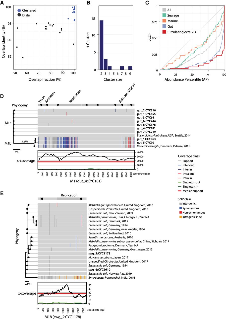 Analysis of circulating ecMGEs. (A) The distribution of cycle tightness metrics across pairs of ecMGEs (>1 kb) in the 32 samples assayed. The overlap identity is defined as the average identity of aligned regions between two cycle genomes. The overlap fraction is defined as the percentage of two cycle genomes that align. For a cycle pair, genomic similarity is defined as the overlap identity times the overlap fraction. Cycle pairs are linked if their genomic similarity is >0.95, and clusters are defined as groups of linked cycles. (B) The distribution of the number of members in clusters. (C) The ECDF of abundance percentile values of circulating ecMGEs compared with ecMGEs stratified by their environment and with all ecMGEs. (D) Detailed view of cluster M1. Data are projected onto a reference “pivot” cluster member (gut4, cycle 181) that is shown in a linear format for visualization purposes. Shown from the bottom up are the x-coverage profiles of the pivot ecMGE member, SNP patterns of cluster members (in bold) and reference sequences (isolate source, location, and year of collection), and annotated genes (on top). SNP patterns are colored according to differences from the pivot, with white indicating segments that failed to align. A phylogenic tree is shown on the left. The units of the scale bar under the tree are mean nucleotide differences. Clades M1a and M1b are marked on the plot. (E) Detailed view of cluster M18, represented as in D.