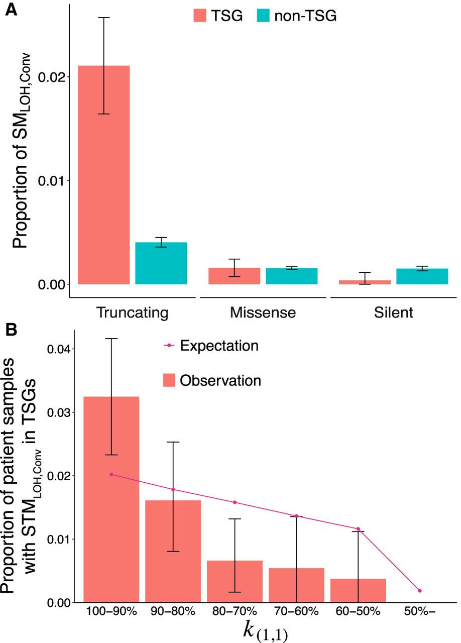 Rate of gene conversion in TSG. (A) Proportions of SMLOH,Convs in TSGs and non-TSGs. The somatic mutations in regions of (α1, α2) = (1, 1) were classified into the TSG (red) and non-TSG (blue) categories, and the proportion of SMLOH,Conv in each category was calculated. (**) P < 0.01, (NS) nonsignificant. (B) The proportion of patient samples with at least one STMLOH,Conv in TSG is plotted for each category of k(1,1), representing the degree of genome instability. The error bars represent the 95% confidence intervals. The pattern in A holds when the data were separated into k(1,1)-high and k(1,1)-low regions (k(1,1) > 90% and the rest) (see Supplemental Fig. S5).