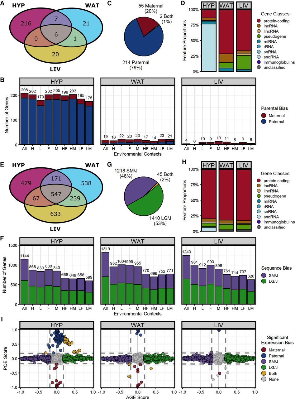 Both classes of ASE patterns are prevalent and distinct. (A) Venn diagram of all parent-of-origin-dependent ASE genes across tissues. (B) Number of significant parentally biased genes in each tissue-by-context analysis (maternal, red; paternal, blue): (All) all contexts; (H) high fat; (L) low fat; (F) females; (M) males; (HF) high fat females; (HM) high fat males; (LF) low fat females; and (LM) low fat males. (C) Summary of ASE biases across all analyses. (D) Proportions of gene classes in each tissue. (E) Venn diagram of all sequence-dependent ASE genes across tissues. (F) Number of significant sequence-biased genes in each tissue-by-context analysis (SM/J, purple; LG/J, green). (G) Summary of ASE biases across all analyses. (H) Proportions of gene classes in each tissue. (I) Parent-of-origin effect (POE) versus allelic genotype effect (AGE) scores in the “All” context of each tissue. Dots represent individual genes and are color coded by their ASE bias direction: (red) maternal; (blue) paternal; (purple) SM/J; (green) LG/J; and (yellow) both ASE classes. Most genes have no bias (gray). Dashed lines indicate significant score thresholds.