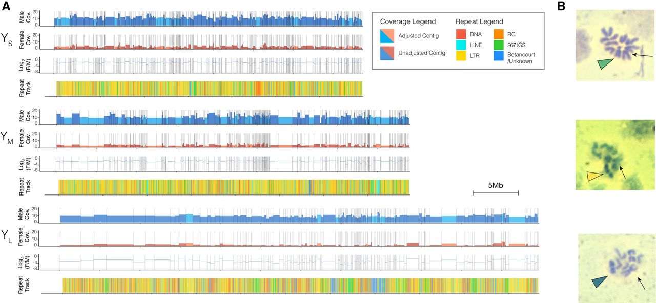 De novo assembly of three differently sized Y Chromosomes (YS, YM, YL). (A) Male and female coverage tracks of Y Chromosome assemblies with Log2(female/male) coverage and repeat landscape shown beneath. One tick mark corresponds to 5 Mb, and collapsed contigs were adjusted in the plots. Landscapes of the most abundant repeats are shown separately in Supplemental Figure S8, A through C. (B, top to bottom) Karyotypes of YS, YM, and YL males with the arrowhead denoting the Y and the arrow denoting the X.