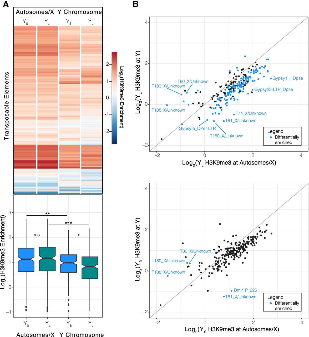 Decreased H3K9me3 enrichment on YL. (A) Heatmap with corresponding boxplot showing H3K9me3 enrichment at TEs by chromosome (autosomes/X vs. Y Chromosomes). Significance values calculated: (*) <0.05, (**) <0.01, (***) <1 × 10−5, Wilcoxon test. (B) Scatterplot of H3K9me3 enrichment at TEs by chromosome group for YS and YL (P < 0.05, two-sample t-test). The gray line indicates similar enrichment levels for both chromosome groups.