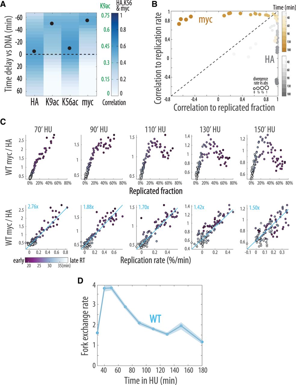 H3 exchange follows replication fork progression. (A,B) Histone incorporation precedes the replication fork and correlates with the replication rate. (A) As in Figure 1E, adding the myc and HA epitope of the exchange sensor marking new and all histones, respectively. Note the different color scales for the epitopes. For additional repeats, see Supplemental Figure S1. n = 4 time courses. (B) myc and HA correlation to replication fraction and rate, analyzed as in Figure 1D. (C,D) Scaling of histone exchange with replicated fraction and replication rate. The genome was clustered based on the annotated RT, and the indicated profile was averaged within each of the 96 clusters (median). (C) The average H3 exchange level (myc/HA) as a function of the replicated fraction (top) or replication rate (bottom). Clusters are colored by their respective RT; time points 70–150 of the time course are shown (for all time points, see Supplemental Fig. S2). The scaling of exchange with the replication rate is summarized in D, displaying the slopes of the linear fits in C (blue lines) (Supplemental Fig. S2). Shading indicates SE (n = 4).