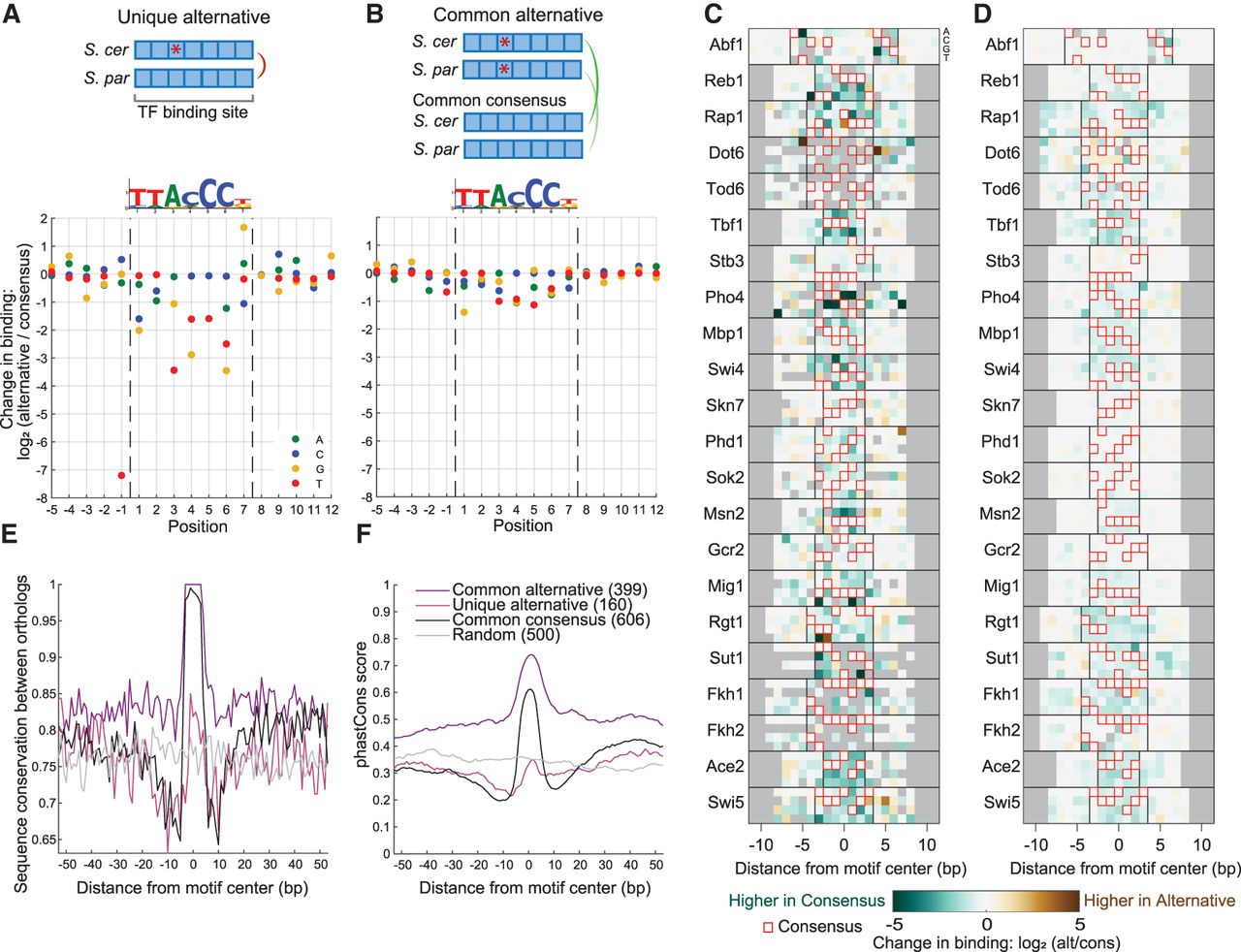 The cost of cis-regulatory mutations on TF binding. (A) The mutation cost of Reb1 measured at unique alternative sites, where one ortholog has the consensus motif (as defined in vitro) and the second ortholog has a one-letter variant (alternative). Each dot represents the mean of at least two sites (for the number of sites, see Supplemental Fig. S9B). Sequence logo of in vitro motif of Reb1 (Fordyce et al. 2010) is presented on top. (B) Mutation cost of Reb1, measured for common alternative sites, where both orthologs have the same one-letter variant. These sites are compared to common consensus sites found elsewhere in the genome. (C) Costs of unique alternatives for 22 TFs. The heatmap represents the change in binding as in A; here, the four rows stand for the four nucleotides A, C, G, T. Red box represents the consensus allele. Minimal two sites, gray color represent missing data. Bases flanking the motif have no consensus sequence, therefore the computation was performed relative to the most common nucleotide. (D) Cost of common alternatives for 22 TFs, as in C. (E) Common alternative binding sites are found at conserved genomic regions. Shown is the sequence conservation between S. cerevisiae and S. paradoxus orthologs (same nucleotide = 1, different nucleotide/ INDEL = 0) at Reb1 binding sites of type: common alternative, unique alternative, and common consensus, as well as in random sites at promoters. Shown is the mean signal per group. The number of sites in each group is indicated in parenthesis. (F) Common alternative sites are conserved through the yeast lineage. The phastCons conservation score (Siepel et al. 2005) is shown for the three Reb1 site groups as in E.