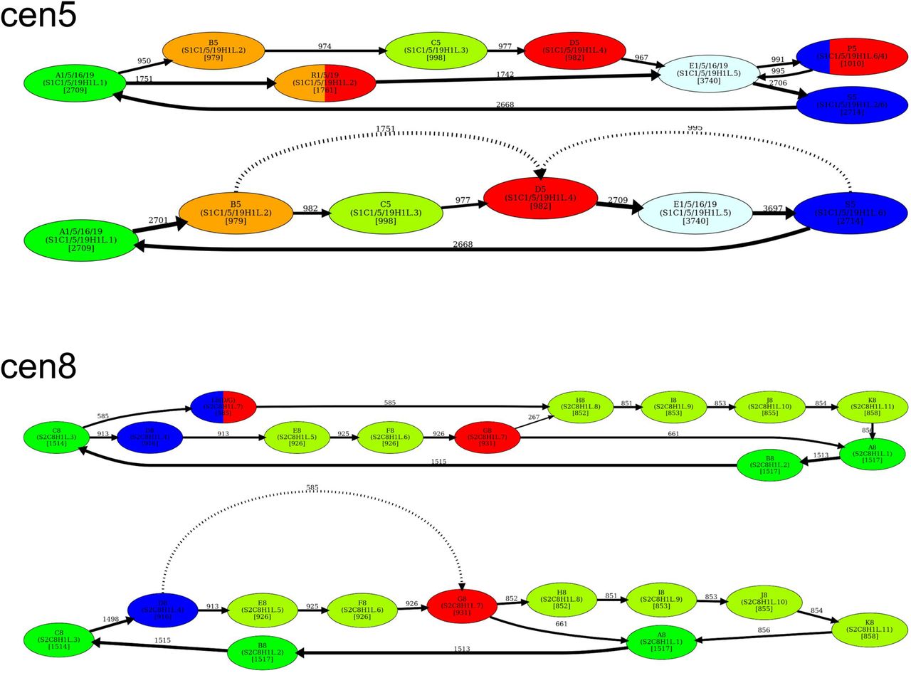 Dehybridization substitutes hybrid vertices (monomers) by hybrid edges in the monomer graph. (Top) Dehybridization of P5 and R1/5/19 in cen5. (Bottom) Dehybridization of L8 in cen8.