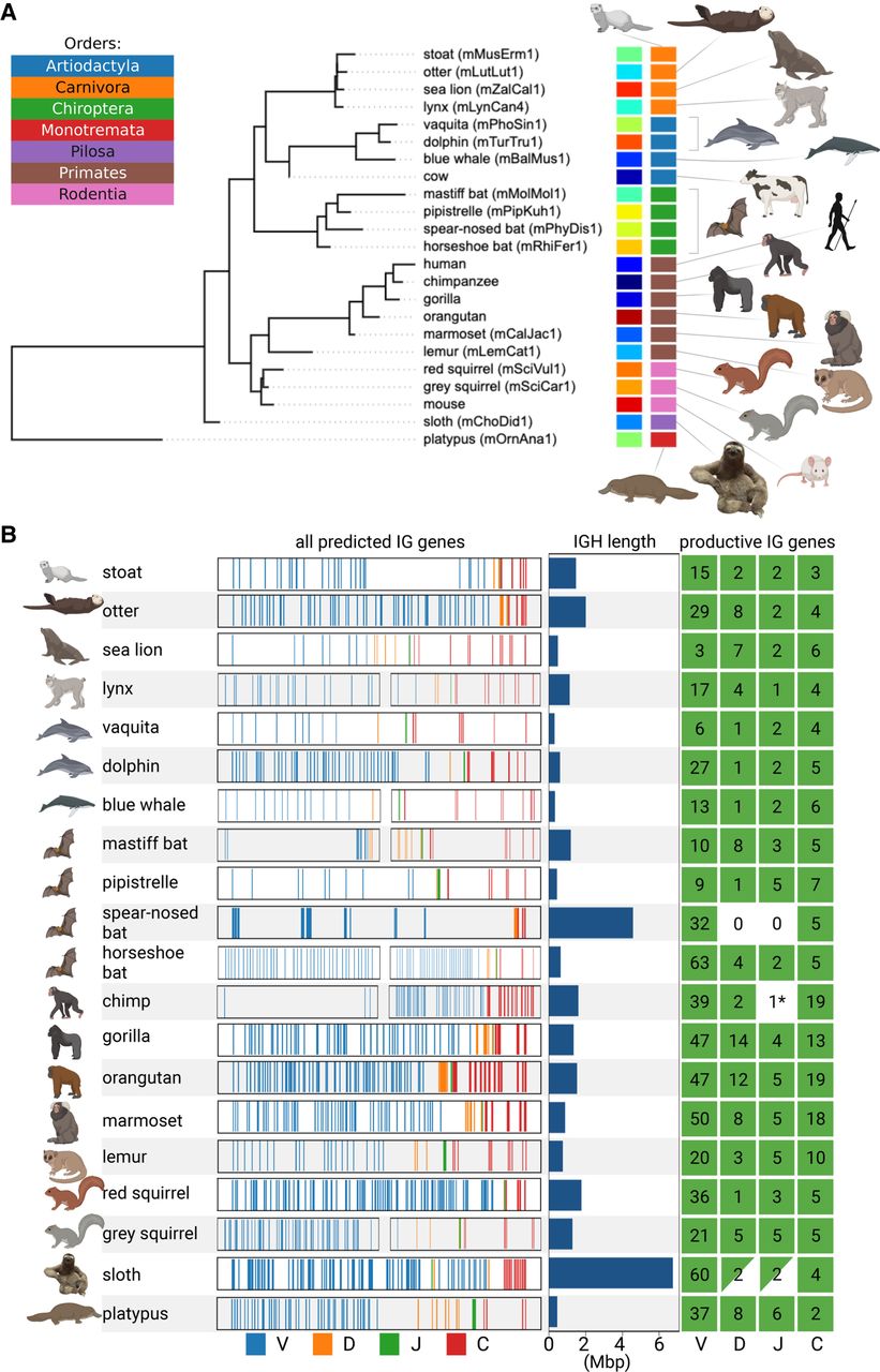 Information about the IGH loci in 20 target mammalian species. (A) The phylogenetic tree formed by 20 target and three reference species. The tree was subsampled from the Tree of Life constructed by Hedges et al. (2015). Each species is shown by its common name and a VGP identifier specified in parentheses if available. Each species is encoded by a unique color (left vertical color panel) and a color representing its order (right vertical color panel). The list of orders is shown in the upper left corner. Here and below visualization was performed using the BioRender and Iroki (Moore et al. 2020) tools. (B) Information about the IGH loci of 20 target species. Each line corresponds to a target species and shows fragments of the IGH locus with positions of candidate V (blue), D (orange), J (green), and C (red) genes. For six out of 20 species, the IGH-end covers <80% of the predicted IGH locus length (lynx, blue whale, mastiff bat, horseshoe bat, chimpanzee, and grey squirrel). We showed both the IGH-start and the IGH-end for these six species and only the IGH-end for the remaining species. For a better visualization, all IGH loci are shown as having the same length that does not reflect their real lengths (the bar plots next to the IGH loci show the predicted lengths). The map on the right shows the counts of the productive V, D, J, and C genes identified in the IGH locus. A C gene is classified as productive if its translated regions (defined by the closest human C gene) does not contain stop codons. Nonzero counts are shown in green. The green triangles indicate partially found and (likely) partially missing D and J genes in the sloth IGH locus. Although IterativeIGDetective did not identify any J genes in two species (chimpanzee and spear-nosed bat) within the boundaries of the IGH loci, it found a highly conserved candidate J gene in a short contig in the chimpanzee assembly (denoted as 1* on the map of the right). IterativeIGDetective did not identify any candidate J genes in the spear-nosed bat, presumably because all its RSSJs did not pass the likelihood threshold.