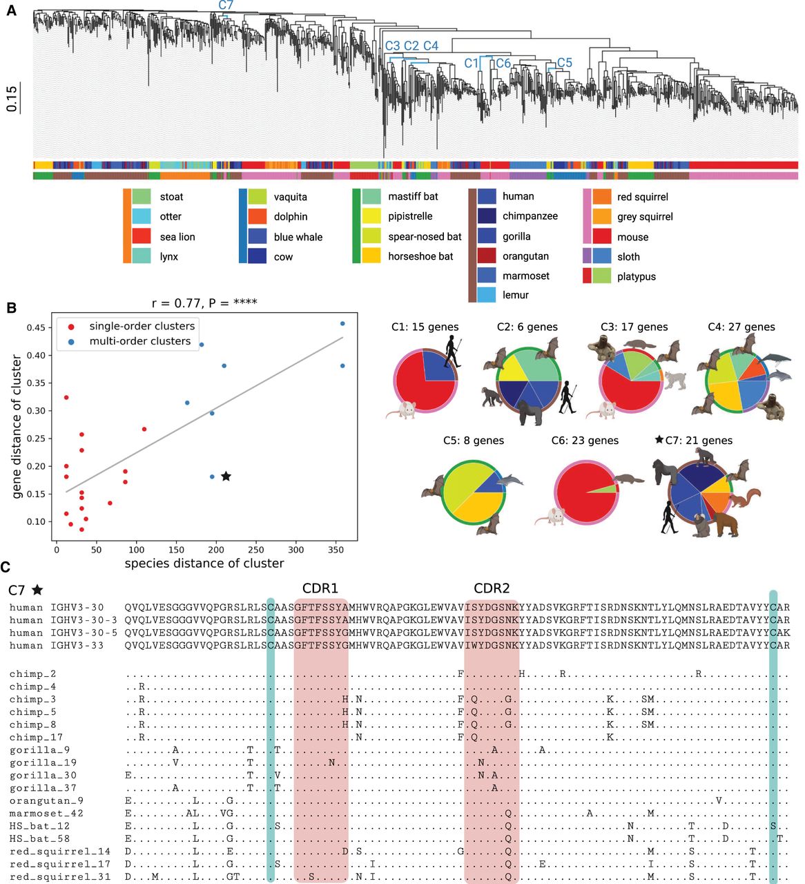 Comparative analysis of mammalian IGHV genes. (A) A phylogenetic tree of IGHV genes in 20 target (581 V genes) and three reference (310 V genes) species. Edges corresponding to clusters C1–C7 described in B are shown in blue. The scale is shown on the left. The upper and lower horizontal bars show colors of species and their orders, respectively. A list of species and their colors is specified below the tree (species from the same order are shown by a colored vertical bar on the left). (B) The plot on the left shows the species distance (x-axis) and the gene distance (y-axis) for 25 large multispecies clusters of V genes. Red and blue dots correspond to single-order and multiorder clusters, respectively. The linear regression line is shown in grey. The Pearson's correlation (r) and P-value (P) are shown on the top of the plot. Each of seven multiorder clusters C1–C7 is represented as a pie chart on the right. An inner (outer) wedge in each pie chart corresponds to a species (an order), and the wedge size is proportional to the number of V genes it contains. (C) Multiple alignment of 21 V genes from the cluster C7. Four human V genes from this cluster are shown on the top. Nonhuman genes are denoted according to the short names of species, and “HS_bat” refers to the horseshoe bat. A position in a nonhuman V gene is shown by a “.” if the amino acid at this position matches the corresponding amino acid in one of four human V genes and by the corresponding amino acid otherwise. Red rectangles show the positions of CDR1 and CDR2 according to the IMGT notation. Green bars show positions of two conserved cysteines (one located close to the start of CDR1 and another located close to the end of the V gene).