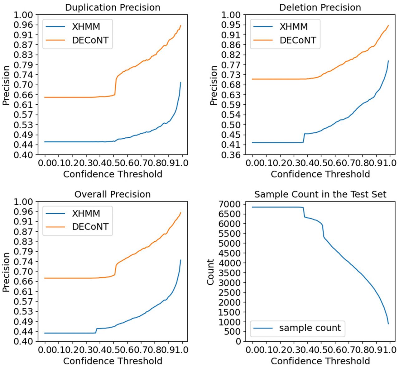 Precision of raw XHMM and DECoNT-corrected XHMM calls are shown with respect to varied confidence threshold (DEL, DUP, and overall precision); 6832 CNV calls made by XHMM on our test data set (the 1000 Genomes Project WES data set test samples) are used. The ground truth is the CNV calls made by CNVnator on the corresponding WGS samples. The last panel shows the number of calls remaining as the threshold gets more conservative. For each polished tool, we used 90% of the calls made on 802 1000 Genomes Project samples for training and the remaining 10% of the calls for testing. This roughly corresponds to a test set size of 80 samples.