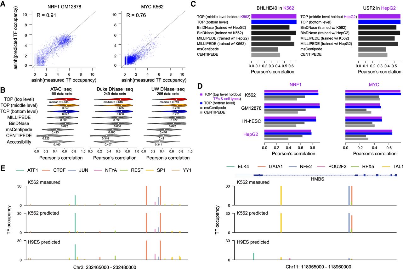 Evaluation of TOP results. (A) Scatter plots show predicted versus measured TF occupancy for test chromosomes of a specific TF in a specific cell type using Duke DNase-seq data, with dots representing the candidate binding sites across the genome. Model performance differs among TFs, as seen in the two examples. (B) Separately for ATAC-seq and DNase-seq data from Duke and UW protocols, violin plots show distribution of Pearson's correlations between predicted and measured TF occupancy (asinh transformed) in test chromosomes. Predictions were made with TOP models at each level of the hierarchy, in comparison with CENTIPEDE, msCentipede, MILLIPEDE, and BinDNase (using log odds of binding probability as a quantitative measurement of TF occupancy), as well as with total accessibility around candidate sites. (C) Comparing prediction performance in scenarios in which ChIP training data are missing for a cell type (indicated in purple). (Left) Predicting TF occupancy with data from K562 held out from training. (Right) Predicting TF occupancy with data from HepG2 held out from training. TOP is trained without any held-out data. MILLIPEDE and BinDNase are trained using a different cell type and also using data that was held out for TOP, showing that TOP performs as well without the held-out data as these methods do with it. msCentipede and CENTIPEDE are unsupervised, so do not require training data; however, their performance is poor. For more, see Supplemental Figure S5. (D) Comparing prediction performance in scenarios in which ChIP training data are missing for both TFs and a cell type (indicated in purple). Data from NRF1 and MYC (and all their TF family members with similar motifs), as well as from HepG2, were held out from training. MILLIPEDE and BinDNase were not included in this comparison as they require training data from the exact TFs. For more, see Supplemental Figure S6. (E) Predicted TF occupancy landscapes for two genomic regions in K562 and H9ES cell types. For K562, ChIP-seq data for these TFs are available and are displayed for comparison; for H9ES, no published ChIP-seq data are available so TOP provides a novel view of TF occupancy in this embryonic stem cell line. (Left) An example genomic region where the occupancy landscape did not change markedly between K562 and H9ES. (Right) An example genomic region near the HMBS gene (involved in heme biosynthesis) where GATA1, TAL1, and NFE2 showed clear cell type–specific occupancy.