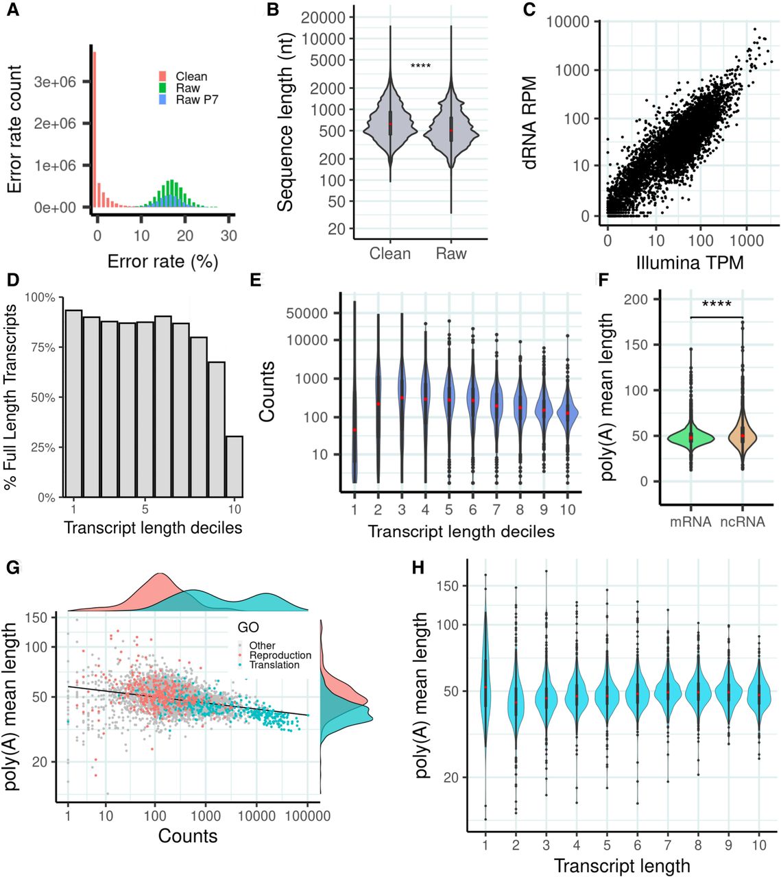 dRNA sequencing (dRNA-seq) of S. pombe. (A) Error rate distribution of raw and clean reads. Error rate is the percentage of aligned positions that contain a mismatch or indel. (Raw) The original reads, (raw P7) original reads with quality score Q ≥ 7, and (clean) corrected reads used in this work. (B) Sequence length distribution of raw and clean reads. Number of raw reads, 7,097,130; number of clean reads, 5,054,233; median value raw reads, 500; and median value clean reads, 620. Differences in the distribution are significant by a Wilcoxon test (P-value < 2.2 × 10−16). (C) Correlation transcript abundance ONT dRNA versus Illumina. The reads were mapped to the PomBase transcriptome. In the case of dRNA reads, we simply divided the number of reads by the number of million reads (reads per million [RPM]). For Illumina reads, we calculated transcripts per million (TMP), normalizing by transcript length as well as number of million reads. We selected transcripts expressed in at least one of the two data sets; transcripts with multimapping Illumina reads were removed. Number of transcripts analyzed was 4999. (D) Estimated number of transcripts with at least one full-length read with respect to transcript length. The data are shown for different transcript length deciles: (71.0–633.2), (633.2–923.4), (923.4–1175.0), (1175.0–1395.0), (1395.0–1637.0), (1637.0–1911.2), (1911.2–2227.4), (2227.4–2695.0), (2695.0–3444.6), (3444.6–15,022.0]. Number of transcripts was 6453. (E) dRNA counts with respect to transcript length. Bins are the same as in D. (F) Poly(A) tail distribution in mRNAs and ncRNAs. Poly(A) tail is estimated as the mean of the poly(A) tail length of all the reads that map to each transcript. Differences are significant according to a Wilcoxon test (P-value < 10−5). (G) Relationship between poly(A) tail length and transcript abundance. For each transcript, the average poly(A) tail length of all the reads mapping to the transcript is taken. Only mRNAs are taken into account for this calculation (n = 4995). Genes related with reproduction (GO:0000003) and translation (GO:0006412) are highlighted. Highly expressed transcripts tend to have shorter poly(A) tails. The correlation is significant (Spearman's ρ = −0.376; P-value = 9.3 × 10−168) (H) Distribution of poly(A) tail length with respect to transcript length. Bins are the same as in D. Poly(A) tail length is homogeneously distributed across different transcript length classes.