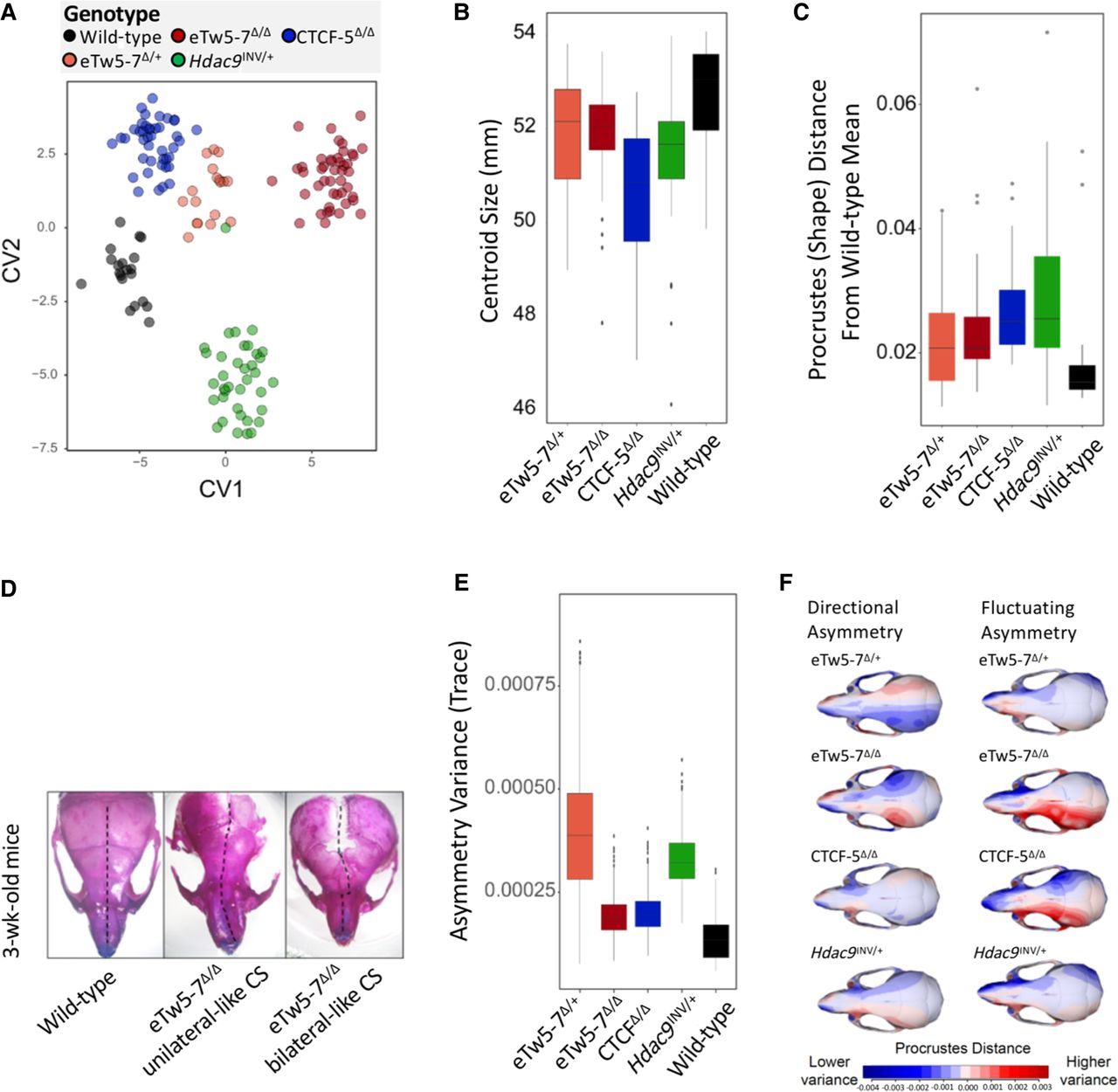 Deletions of Twist1 regulatory elements lead to craniosynostosis-like morphology. (A) Canonical variate analysis (CVA) of micro-CT data from eTw5-7Δ/Δ, eTw5-7Δ/+, CTCF-5Δ/Δ, and Hdac9INV/+ mice compared to wild type. (B) Cranial size by genotype. (C) Box plot for procrustes (shape) distances for each individual from the wild-type mean shape. Note that because the procrustes distance is unsigned, the average and minimum procrustes distance for the wild type is positive and not 0. (D) Representative pictures of stained skulls of 3-wk-old wild-type and eTw5-7Δ/Δ mice, showing a range of variation in skull morphology. The dashed black line represents the asymmetric structure with unilateral (middle) and bilateral (right) craniosynostosis-like phenotypes. (E) Box plot of the asymmetry variance differences among the different genotypes and the wild type. It depicts group differences in the amount of variance explained by the asymmetric component of shape variation of the skull. (F) Heat map visualizations for each asymmetry component (directional asymmetry and fluctuating asymmetry), displaying the patterns of shape variation in each genotype compared to the wild type.