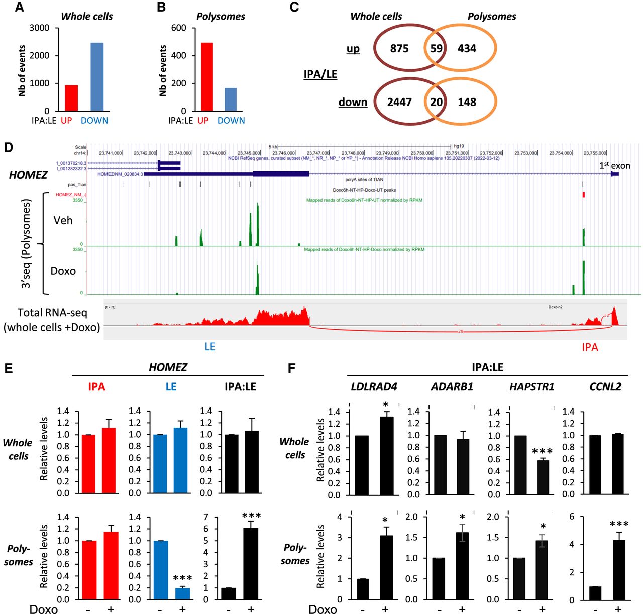 IPA:LE isoform ratio up-regulation by Doxo is more prevalent in the translatome than in the transcriptome. (A,B) Identification of IPA isoforms regulated by Doxo relative to matched last-exon isoform (IPA:LE ratio) by 3′-seq on whole MCF-7 cells and polysomes. Only abundant IPA isoforms (equalizing at least 5% of matched LE isoform) are shown. (C) Venn diagram comparing IPA:LE regulation events by Doxo in whole cells and polysomes. (D) Visualization of 3′-seq and total-RNA-seq data for the HOMEZ gene in the UCSC Genome Browser and Integrative Genomics Viewer, respectively. (E,F) RT-qPCR analysis of IPA:LE isoform ratio regulation by Doxo in the indicated genes in whole cells and in polysomes. Data on individual isoforms are also shown for HOMEZ. (*) P < 0.05; (***) P < 0.001.