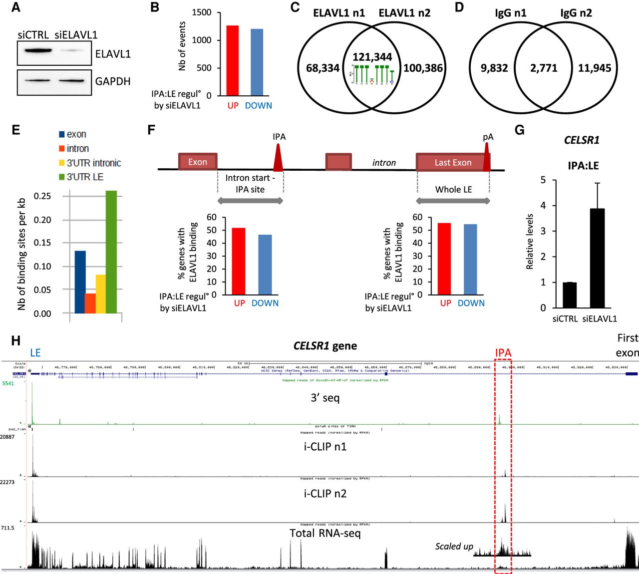 The IPA:LE isoform ratio is widely and directly regulated by ELAVL1. (A) Western blot analysis of ELAVL1 protein levels in MCF-7 cells transfected with an siRNA targeting ELAVL1 (siELAVL1) or a negative-control siRNA (siCTRL). (B) Identification by 3′-seq on whole MCF-7 cells of abundant IPA isoforms, for which the IPA:LE ratio is regulated by siELAVL1 when compared to siCTRL. (C) Venn diagram comparing the peaks found in two biological replicates of ELAVL1 iCLIP in whole MCF-7 cells. Overlapping peaks were considered ELAVL1 binding sites. The most enriched motif is shown. (D) Venn diagram comparing the peaks found in two biological replicates of iCLIP using nonspecific immunoglobulin (IgG). (E) Density of ELAVL1 binding sites in exons, introns, 3′ UTRs overlapping introns, and 3′ UTRs overlapping the last exon of genes. (F) Fraction of genes that have an ELAVL1 binding site in the indicated IPA or LE region, among the genes that are either up- or down-regulated by siELAVL1 at the level of IPA:LE isoform ratio. (G) RT-qPCR analysis of the effect of ELAVL1 siRNA on the IPA:LE isoform ratio in the CELSR1 gene. (H) Visualization of 3′-seq, iCLIP, and total RNA-seq data for the CELSR1 gene in the UCSC Genome Browser.