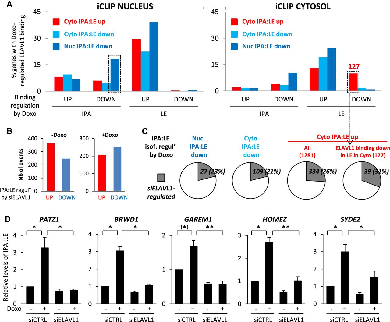 ELAVL1 coordinately regulates IPA isoforms in the nucleus and cytosol in response to Doxo. (A) Intersection of the three main categories of Doxo-regulated IPAs (Cyto IPA:LE up, Cyto IPA:LE down, and Nuc IPA:LE down, as identified by 3′-seq in Fig. 2A) with nuclear and cytosolic Doxo-regulated ELAVL1 binding sites located in IPA and LE regions (as indicated at the bottom). Plotted is the percentage of Doxo-regulated IPAs of each category that have a Doxo-regulated ELAVL1 binding site in the indicated region. (B) Identification of abundant IPA isoforms for which the IPA:LE ratio is regulated by siELAVL1 when compared to siCTRL, by 3′-seq analysis on cytosol of MCF-7 cells grown either without or with Doxo. (C) Intersection of the three main categories of Doxo-regulated IPAs (Cyto IPA:LE up, Cyto IPA:LE down, and Nuc IPA:LE down) with siELAVL1-regulated IPAs. (D) RT-qPCR analysis of the effects of Doxo and siELAVL1 on the cytosolic IPA:LE isoform ratio in the indicated genes. (*) P = 0.06; (**) P < 0.01.