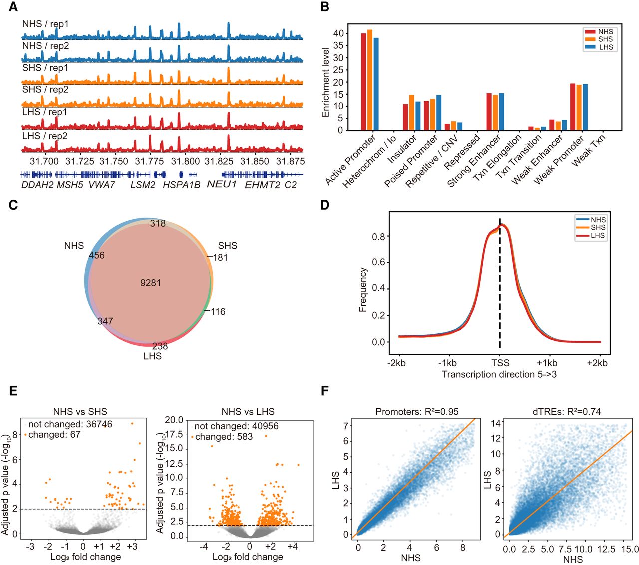 Local chromatin environments remains stable during the whole process of HS. (A) ATAC-seq signal profiles (observed/expected calculated by MACS2) of the biological replicates at the NHS, SHS, and LHS conditions. The 200-kb region centered at the TSS of HSPA1B gene is shown. Only a part of gene symbols is listed owing to the limited space. (B) Distribution of ATAC-seq peaks over genome elements in the three conditions. (C) Numbers and overlaps of accessible genes (TSSs covered by NFRs) in the three conditions. (D) Distributions of NFRs around TSSs of accessible genes. (E) Volcano plot showing the results of the differential accessibility analysis in NFRs before and after HS. Accessibility was measured by the coverage depth of short ATAC-seq fragments. (F) Comparisons of accessibility levels of promoters and dTREs before (NHS) and after LHS. The lines mark the regression fits.