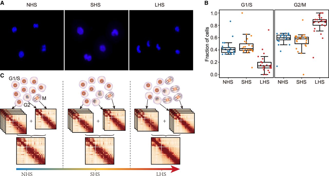 Cell cycle redistribution after LHS contributes to observed Hi-C contact map changes. (A) Representative images showing cell cycle phase in sorted G2/M cells for the three conditions. (B) Estimated cell fractions of G1/S- and G2/M-phase cells in mixed cells before and after HS calculated from different chromosomes. (C) Schematic diagram shows the main discoveries of our study.