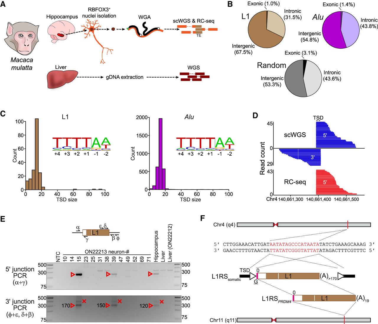 Characterization of germline and somatic macaque TE insertions. (A) Genomics experimental design. Individual hippocampal neuron (RBFOX3+) nuclei from two rhesus macaques (ON22212 and ON22213) were subjected to whole-genome amplification (WGA), followed by Illumina scWGS and RC-seq, to identify somatic TE insertions. Bulk liver DNA was analyzed with Illumina WGS to discriminate germline and somatic variants. (B) Percentages of exonic, intronic, and intergenic nonreference L1 (top left) and Alu (top right) insertions. Genomic features were annotated according to RefSeq coordinates, with the underlying proportions of each feature (random expectation) shown at bottom. (C) Target site duplication (TSD) size distributions for nonreference L1 (left) and Alu (right) insertions, as annotated by TEBreak. Inset sequence logos (Crooks et al. 2004) display the observed integration site nucleotide composition for each TE family. These resembled the L1 endonuclease motif. (D) A somatic L1RS2 insertion (L1RSsomatic) was detected on Chromosome 4 of animal ON22213 hippocampal neuron #15. Reads spanning the 5′ or 3′ L1–genome junctions of this event are shown, as is the corresponding TSD. (E) PCR validation of L1RSsomatic. Primer (symbols α, ε, δ, γ, β, and Φ) positions relative to the L1 insertion are indicated in the schematic provided at top. The 5′ L1–genome junction was amplified by combining primers α and γ, whereas nested PCR (ε + Φ then δ + β) was used to amplify the 3′ L1–genome junction. Reaction input in each case consisted of nontemplate control (NTC), 13 ON22213 hippocampal neurons analyzed with scWGS and RC-seq, bulk ON22213 hippocampus and liver DNA, and bulk ON22212 liver. Red arrowheads and crosses indicate amplicons confirmed as on-target and off-target, respectively, by capillary sequencing. Numbers next to confirmed 3′ L1–genome junction bands indicate the L1 poly(A) tract length for that amplicon. (F) Complete sequence characterization of L1RSsomatic. TSD nucleotides are highlighted in red. The intergenic L1 was full length (L1RS2 subfamily consensus start position 0), carried a 4-bp 5′ transduction (pink rectangle) with an untemplated guanine (underlined G), and was followed by a long, pure 3′ poly(A) tract. The transduction indicated a putative donor L1 intronic to the PRDM4 gene on Chromosome 11 (L1RSPRDM4).