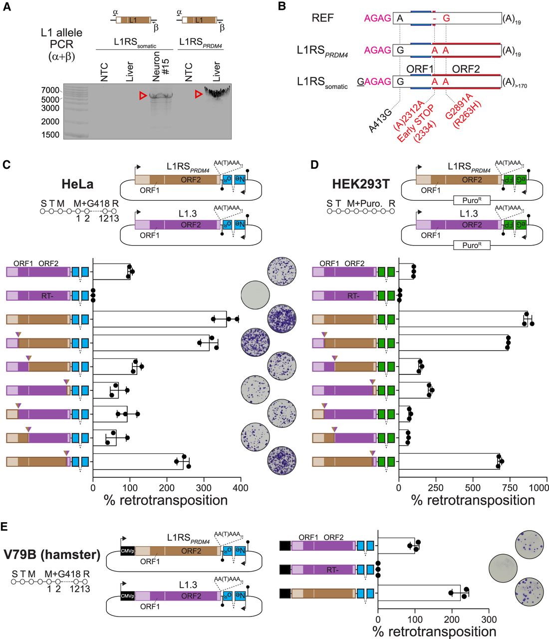 An endogenous L1 that is mobile in the macaque brain and in vitro. (A) The complete sequence of L1RSsomatic and its homozygous donor element, L1RSPRDM4, was amplified by PCR reactions (primers α + β) with input template DNA from ON22213 neuron #15 and bulk liver, respectively. Note that primer α spanned the 5′ junction of L1RSsomatic to more efficiently amplify the L1 allele. Red arrowheads indicate amplicons confirmed as on-target by capillary sequencing. (B) L1RSsomatic and L1RSPRDM4 were cloned and completely capillary-sequenced. Nucleotide variants among the reference (REF) genome L1RSPRDM4 sequence, the two identical L1RSPRDM4 alleles carried by animal ON22213, and the L1RSsomatic sequence are shown. Nonsynonymous mutations are highlighted in red. The 4-bp 5′ transduction (AGAG) carried by L1RSsomatic is colored in pink. (C) Engineered L1 retrotransposition efficiency measured in cultured HeLa cells (Moran et al. 1996). The assay design (top) shows either L1RSPRDM4 (brown) or L1.3 (purple), a highly mobile human L1 (Dombroski et al. 1993), tagged with a neomycin (G418)-resistance cassette activated only upon retrotransposition. (S) Seeding, (T) transfection, (M) change of media, (R) result analysis, (filled lollipop) polyadenylation signal. Numbers represent days of treatment with G418. AA(T)AAA indicates where a thymine base was removed to ablate the natural L1RSPRDM4 and L1.3 polyadenylation signals. Tested elements (bottom) included, in order, positive (L1.3) and negative (L1.3 RT−, D702A mutant) controls (Moran et al. 1996; Sassaman et al. 1997); L1RSPRDM4; a set of three chimeric elements where L1.3 was fused to L1RSPRDM4 at the 3′ end of the L1.3 5′ UTR, ORF1, and ORF2; and a set of three reciprocal elements where L1RSPRDM4 and L1.3 were joined at the 3′ end of the L1RSPRDM4 5′ UTR, ORF1, and ORF2 sequences. L1 expression was driven by native promoters only. Chimeric element fusion points are marked by inverted triangles. Representative well pictures are shown. Histogram values are normalized to L1.3 (100%). Data consist of three technical replicates and their mean ± SD, obtained from one representative experiment of three independent biological replicates. (D) As per C, except assayed in HEK293T cells using an EGFP-based L1 reporter system (Ostertag et al., 2000) in which cells are selected for puromycin resistance, and retrotransposition efficiency is measured as the percentage of EGFP+ sorted cells. (E) As per C, except with the inclusion of a cytomegalovirus promoter (CMVp) to additionally drive L1RSPRDM4 and L1.3 expression, as well as testing in the Chinese hamster fibroblast V79B cell line.