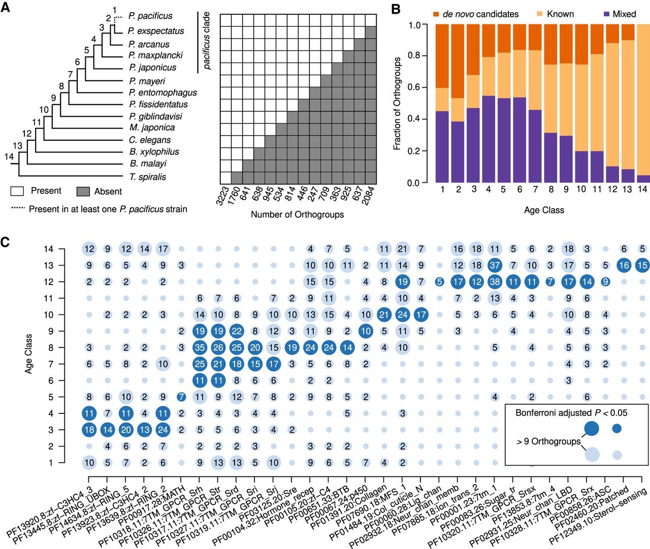 Duplications and new gene formation shape genome evolution. (A) The presence/absence patterns of species in a given orthogroup were used to assign orthogroups to 14 distinct age classes. The age classes define a branch in the schematic phylogeny (Rödelsperger et al. 2018; Smythe et al. 2019), at which a given orthogroup evolved. (B) Orthogroups were classified as known if more than half of the genes had recognizable protein domains and classified as de novo candidates if there was no BLASTP hit against sequences from a set of outgroup species. The remaining orthogroups were classified as mixed. Although older age classes are dominated by members of known gene families, younger age classes are biased toward de novo candidates. (C) The circles represent the number of orthogroups with a given protein domain, and the color code indicates significant enrichments within an age class.