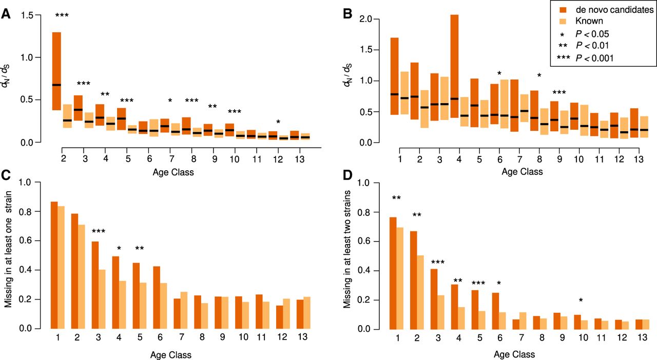 De novo candidates are less constrained and more frequently lost than recent duplicates. (A) The box plot shows the median and interquartile ranges of dN/dS ratios with regard to P. exspectatus orthologs for different age groups. The comparison between de novo candidates and known orthogroups shows evidence that de novo candidates are less constrained than recent duplicates of known gene families. (B) Estimation of evolutionary constraint between the P. pacificus strains PS312 and RSB001 shows a trend toward significantly higher dN/dS ratios of de novo candidates for multiple age classes. (C) The plot shows for each age class the fraction of orthogroups, where an ortholog is missing in at least one P. pacificus strain. Comparison between de novo candidates and known categories shows that de novo candidates are significantly more likely to be lost in three age classes. (D) De novo candidates show an even stronger trend toward higher probabilities of being lost than recently duplicated members of known gene families, if we consider only orthogroups with predicted losses in at least two P. pacificus strains.