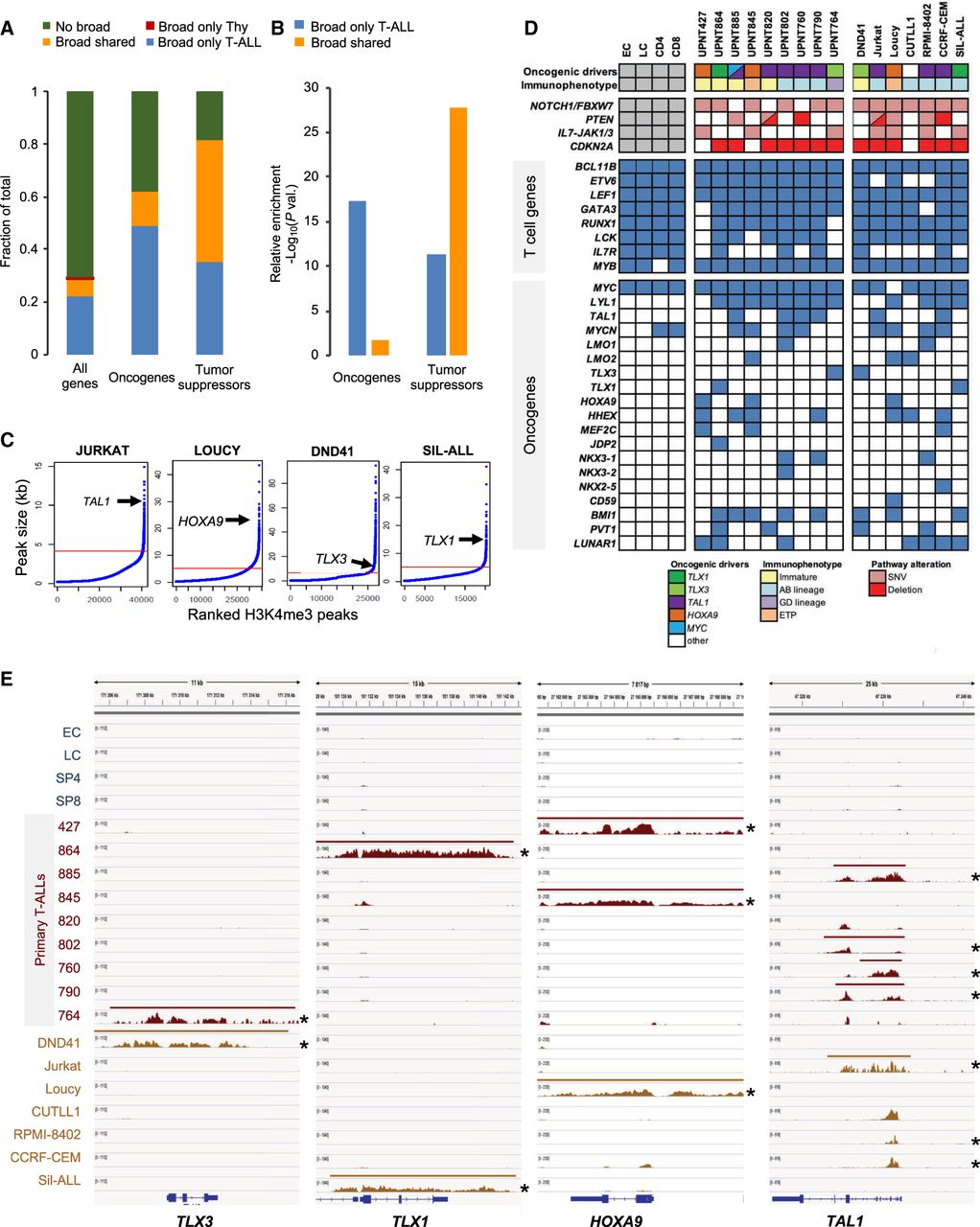 Characterization of broad H3K4me3 domains in T-ALL samples. (A) Distribution of the indicated category of genes associated with broad H3K4me3 domains only in thymocytes (Tc), only in T-ALL, in both thymocytes and T-ALL (shared), or without broad H3K4me3 domain (no broad). Oncogenes and tumor suppressors are listed in Supplemental Table S5. Note that no oncogene or tumor suppressor gene was associated with a broad H3K4me3 domain only in thymocytes. (B) Relative enrichment for oncogenes and tumor suppressors associated with the broad H3K4me3 domain only in T-ALL or shared between T-ALL and thymocytes was assessed by hypergeometric tests. (C) The H3K4me3 peaks were ranked according to their size for the indicated T-ALL cell lines. The inflection point allowing the selection of broad H3K4me3 domains is indicated by a red line. The position of the broad H3K4me3 domains associated with the representative oncogene is shown for each cell line. (D) Table showing the association of broad H3K4me3 domains with oncogenes frequently activated in T-ALL. The maturation states and main oncogenetic alterations of T-ALL samples are shown. (E) Examples of key oncogenes associated with broad H3K4me3 domains in T-ALL cells. H3K4me3 ChIP-seq signal and broad H3K4me3 domain tracks are shown for each thymocyte population and T-ALL sample. Asterisk indicates ectopic expression of the oncogene.