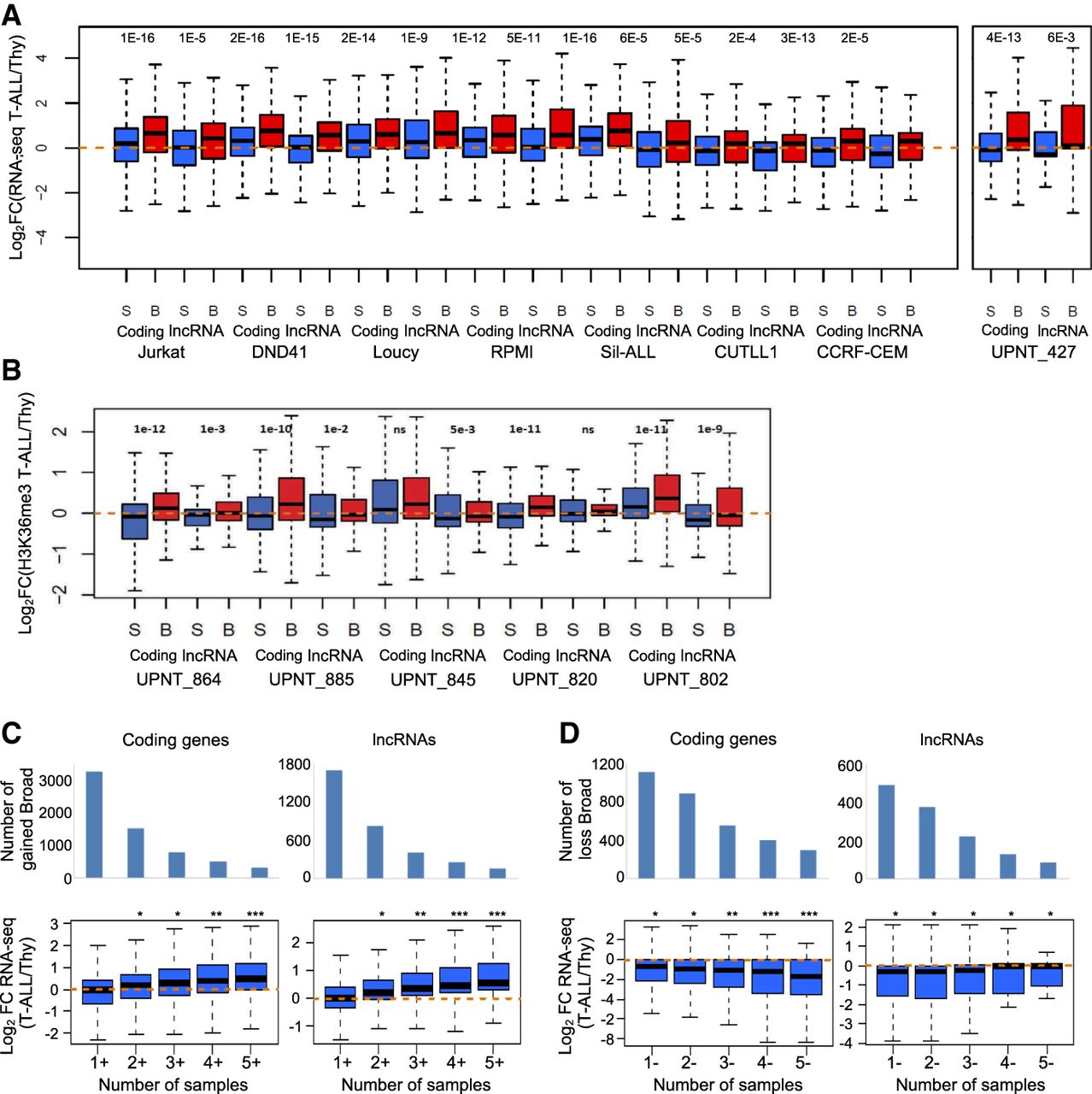 Dynamic expression of broad H3K4me3 domain–associated genes. (A,B) Two sets of equally expressed genes associated with broad (B) or sharp H3K4me3 peak (S) in the indicated T-ALL sample were defined based on RNA-seq data (A) or H3K4me3 gene-body enrichment (B). The fold change in expression between the T-ALL samples and the normal T cell populations was determined. (C,D) Gene expression in the function of the frequency of association with broad H3K4me3 domains in primary T-ALL samples. Genes specifically associated with broad H3K4me3 domains in T-ALL samples were separated according to the cumulative number of samples with gain (C) or loss (D). The fold change expression of coding genes and lncRNAs between the thymus and a series of independent 41 T-ALLs was analyzed. (***) P < 0.001, (**) P < 0.01, (*) P < 0.05, Wilcoxon rank-sum test; (ns) not significant.