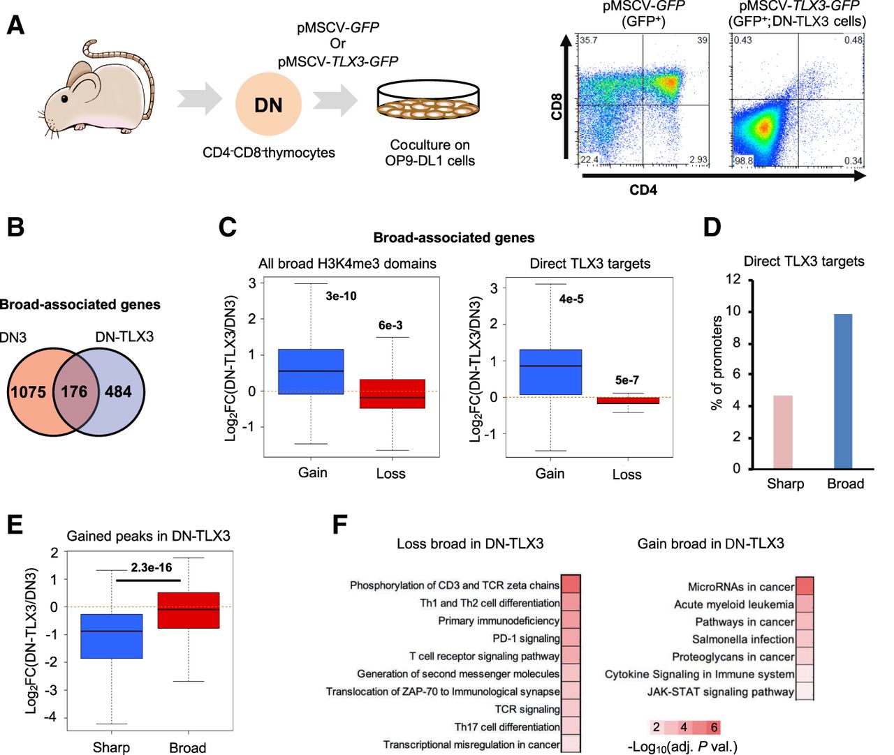 Dynamics of broad H3K4me3 domains in a mouse model of T-ALL. (A) Experimental workflow. Double-negative thymocytes were infected with a retroviral vector expressing TLX3 oncogene and/or the GFP. After 1 mo of coculture with OP9-DL1 stromal cells, the GFP-positive cells were purified and analyzed by FACS. TLX3 expression was confirmed by western blot using a custom-made antibody (Supplemental Figure S10A; Dadi et al. 2012). (B) Overlap between the broad H3K4me3 domains found in DN thymocytes from wild-type mice and TLX3+ leukemic cells (DN-TLX3). (C) Boxplot showing the fold change of expression of genes associated with broad H3K4me3 domains only in DN-TLX3 (gain) or DN (loss; left panel). (Right) Only the direct targets of TLX3 were analyzed. (D) Percentage of broad- and sharp-associated genes in DN-TLX3 cells that are direct targets of TLX3 based on TLX3 ChIP-seq. (E) Two sets of equally expressed genes associated with broad or sharp H3K4me3 peaks in DN-TLX3 cells were defined. The fold change of the expression between DN-TLX3 and DN was determined. (F) KEGG pathways significantly enriched for the gene sets associated with broad H3K4me3 domains only in DN-TLX3 (gain) or DN (loss; adjusted P-value < 0.01). The inverted log10 of the Benjamin-corrected P-value is shown. (C) Significance was assessed by a Wilcoxon signed-rank test. (E) Significance was assessed by a Wilcoxon rank-sum test.