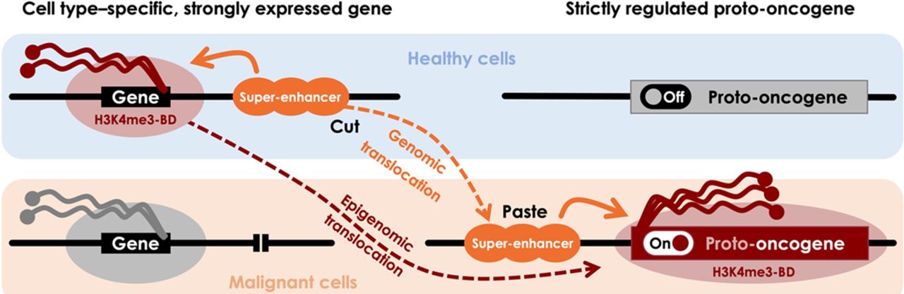 Scheme of epigenomic translocation model. In healthy cells, a cell-identity or tumor suppressor gene is expressed by regulation of a super-enhancer that generates an H3K4me3 broad domain (H3K4me3-BD), allowing rapid and consistent activation of the transcriptional machinery (upper left). Proto-oncogenes are strictly regulated to control important physiological processes including the cell cycle (upper right). During a genomic translocation event, a super-enhancer is juxtaposed close to a proto-oncogene, resulting in oncogenic activation (bottom right). Relocation of the super-enhancer brings the transcriptional machinery, including the H3K4me3-BD. This epigenomic signature disappears at the original locus (bottom left).