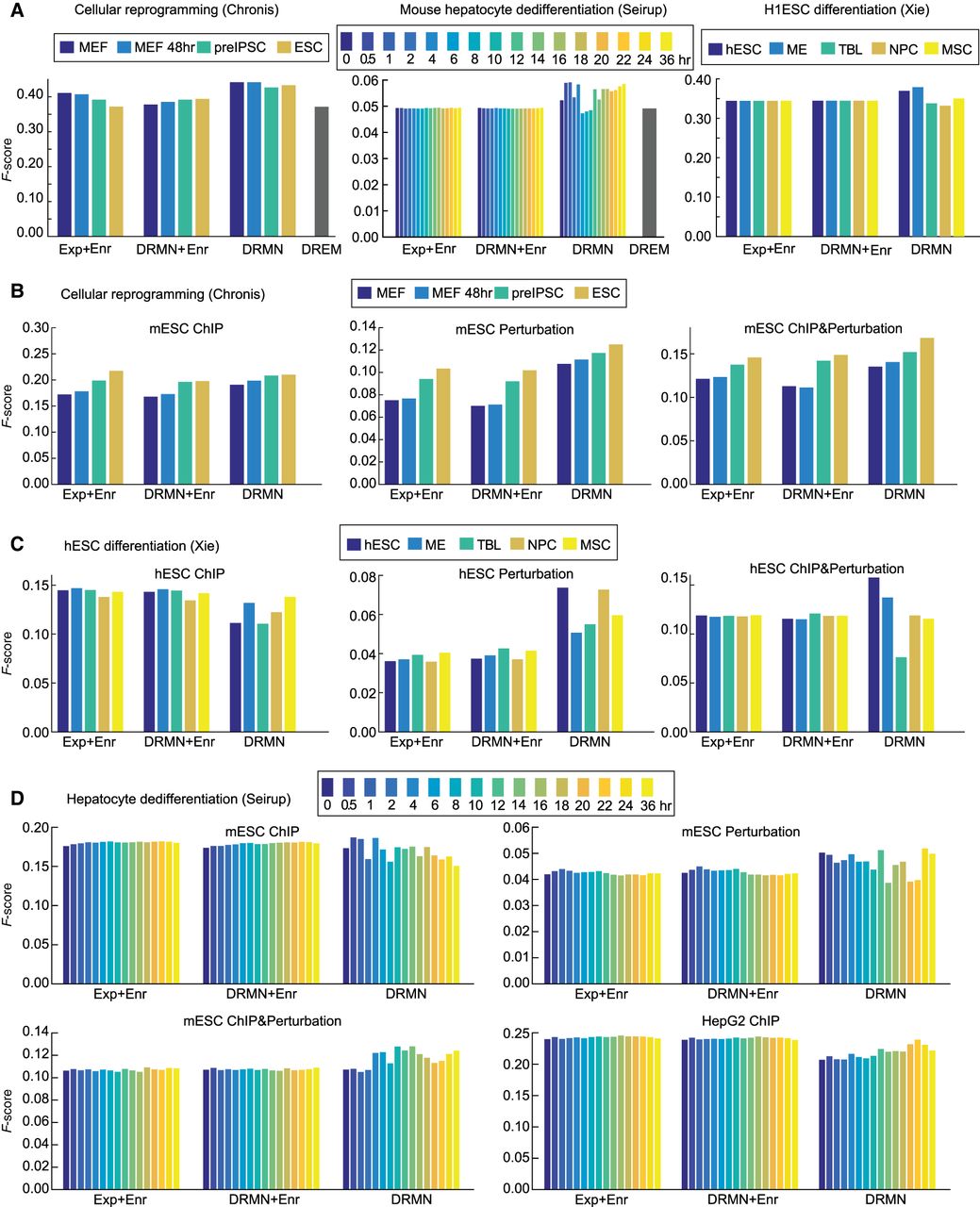 Performance of regulator ranking and inferred networks of DRMN. (A) The F-score of regulator ranking with different strategies for cellular reprogramming, mouse hepatocyte dedifferentiation, and H1ESC differentiation. Each plot shows regulator enrichment of expression-based modules (Exp + Enr), regulator enrichment of DRMN modules (DRMN + Enr), regulator ranking based on inferred DRMN networks (DRMN), and regulator ranking from DREM (when applicable). (B) F-score-based performance of inferred networks and baseline networks for cellular reprogramming, when compared to ChIP-based, perturbation-based, and intersection of the ChIP and perturbation-based gold standards in mESCs. (C) F-score-based performance of inferred networks and baseline networks for H1ESC differentiation, when compared to ChIP-based, perturbation-based, and intersection of the ChIP- and perturbation-based gold standards in hESCs. (D) F-score-based performance of inferred networks and baseline networks for mouse hepatocyte dedifferentiation, when compared to ChIP-based, perturbation-based, and intersection of the ChIP- and perturbation-based gold standards for mESCs, as well as the ChIP-based gold standard from the HepG2 cell line. In each panel, we show the baseline networks from regulator enrichment of expression-based modules (Exp + Enr), regulator enrichment of DRMN modules (DRMN + Enr), and inferred networks with edges scored by input feature multiplied by estimated regression coefficients (DRMN).
