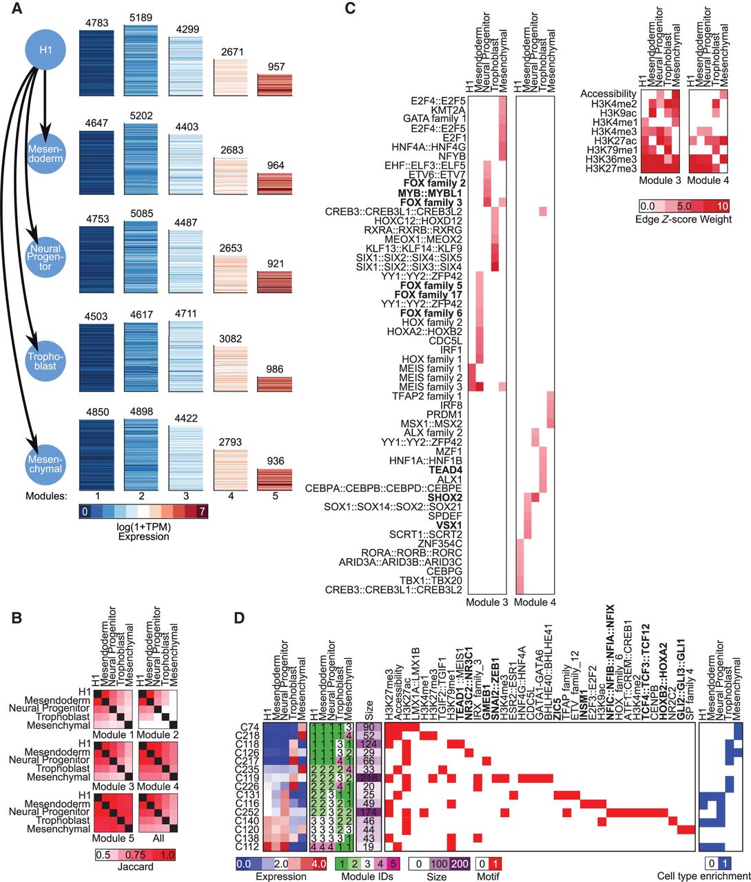 Application of DRMNs to ESC differentiation data set using histone marks, accessibility, and Q-motifs. (A) Shown are gene expression (log 1 + TPM) patterns of the k = 5 modules for each lineage (major row). The number above the heatmap is the number of genes in that module. The color corresponds to the level of expression, with more red denoting high expression and more blue denoting low expression. (B) Similarity of modules across lineages as measured by Jaccard index. The color intensity is proportional to the module match. (C) Inferred regulators for each module across time. Only modules with highest expression (3 and 4) and that had TFs as regulators are shown. The red intensity is proportional to the z-score significance of the regression weight of a regulator. For all values, see Supplemental Table S6. (D) Selected transitioning gene set profiles showing changes into the high expression modules (3, 4, 5). Shown are the mean expression levels of genes in the gene set (left; red–blue heatmap), the module assignment (second), the number of genes in each module (third), the set of regulators for each gene set (white–red heatmap), and enrichment in lineage-specific gene sets from Xie et al. (2013). The complete transitioning gene set is shown in Supplemental Figure S14. Some of the regulator names were shortened for space; the full names are available in Supplemental File S7. Bolded names are those discussed in the text.